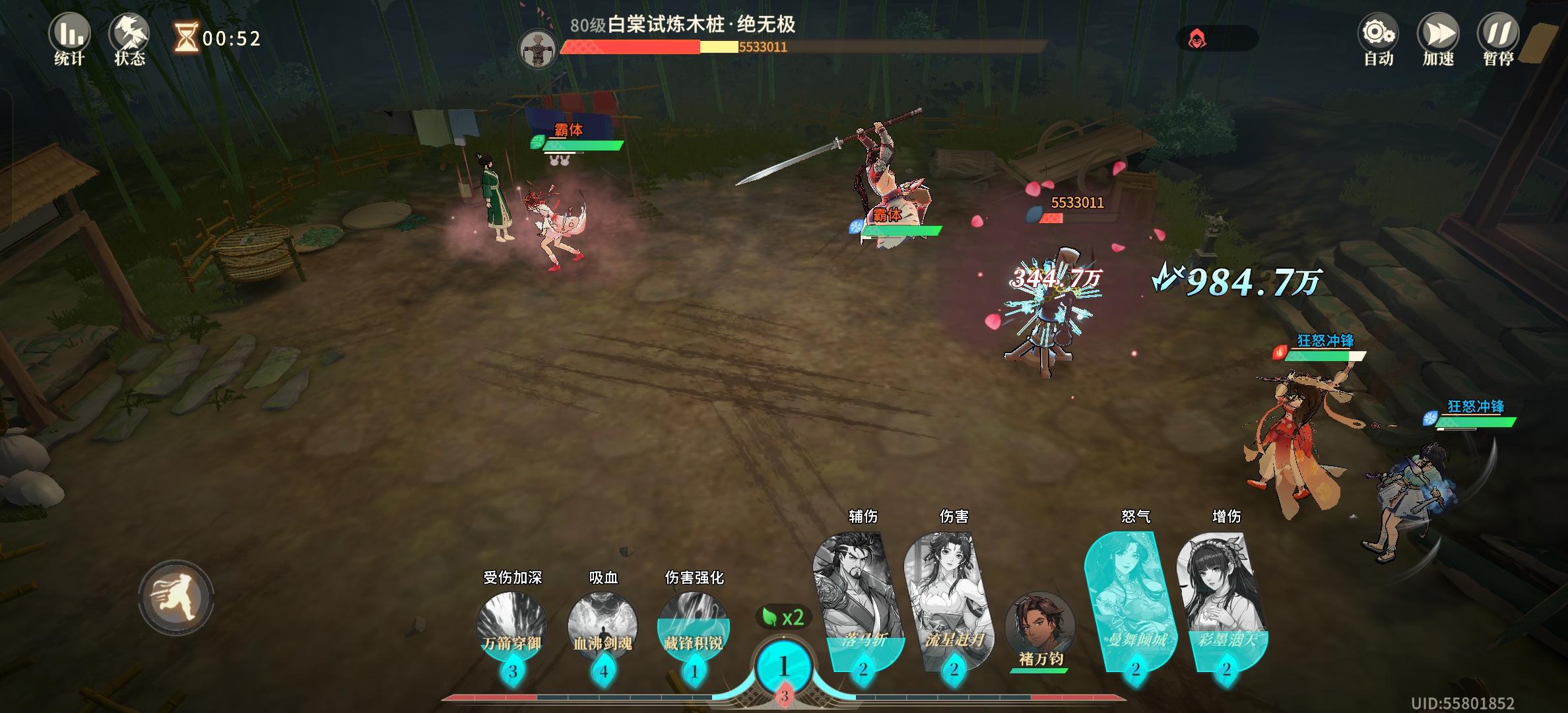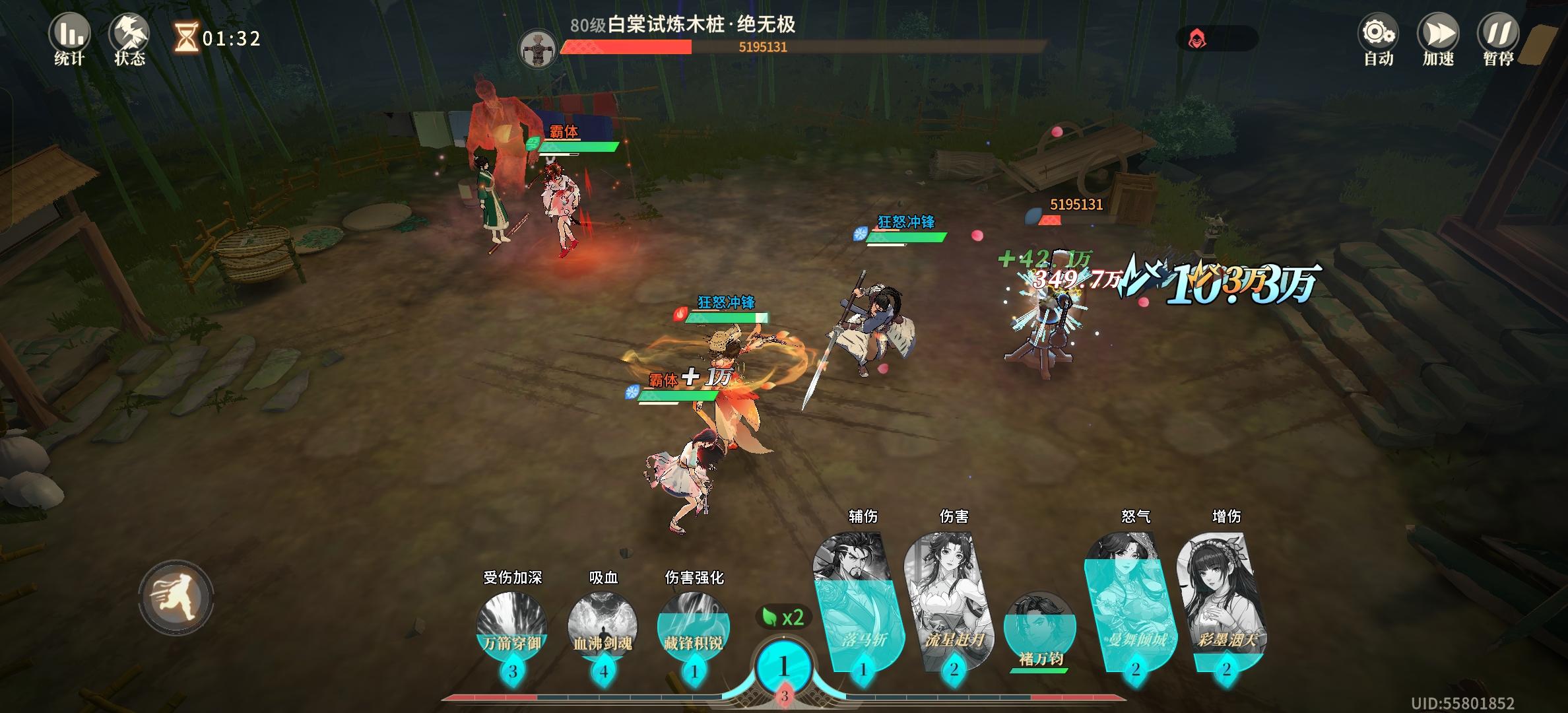 潜能和经脉和角色的自动技给到的系数提升都是建立在憋印记下去实现伤害的,伤害还能凹,天赋得一分钟后才吃的满了。目前简单测一下禇万钧(惩恶),小语(惩恶),吴渊(惩恶),然后策略万箭(没打满),血沸剑魂,藏锋积锐去叠buff,给到木桩子直伤1000万,飞鸿给的白字真伤350万。