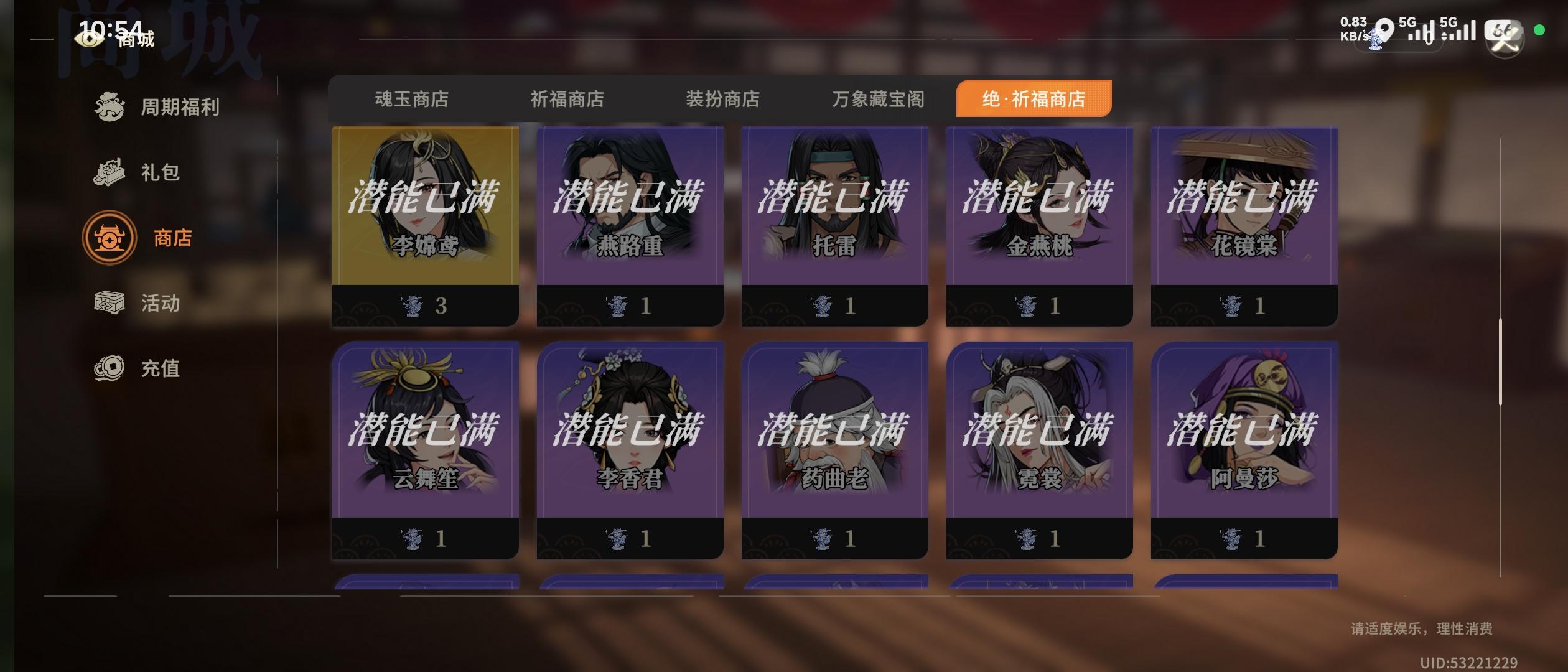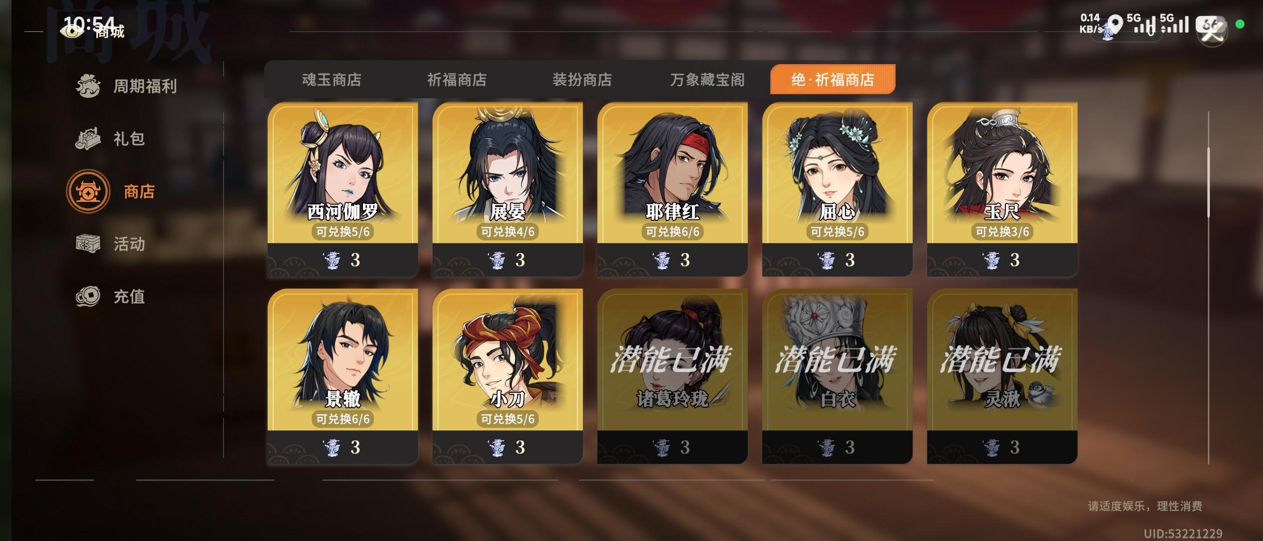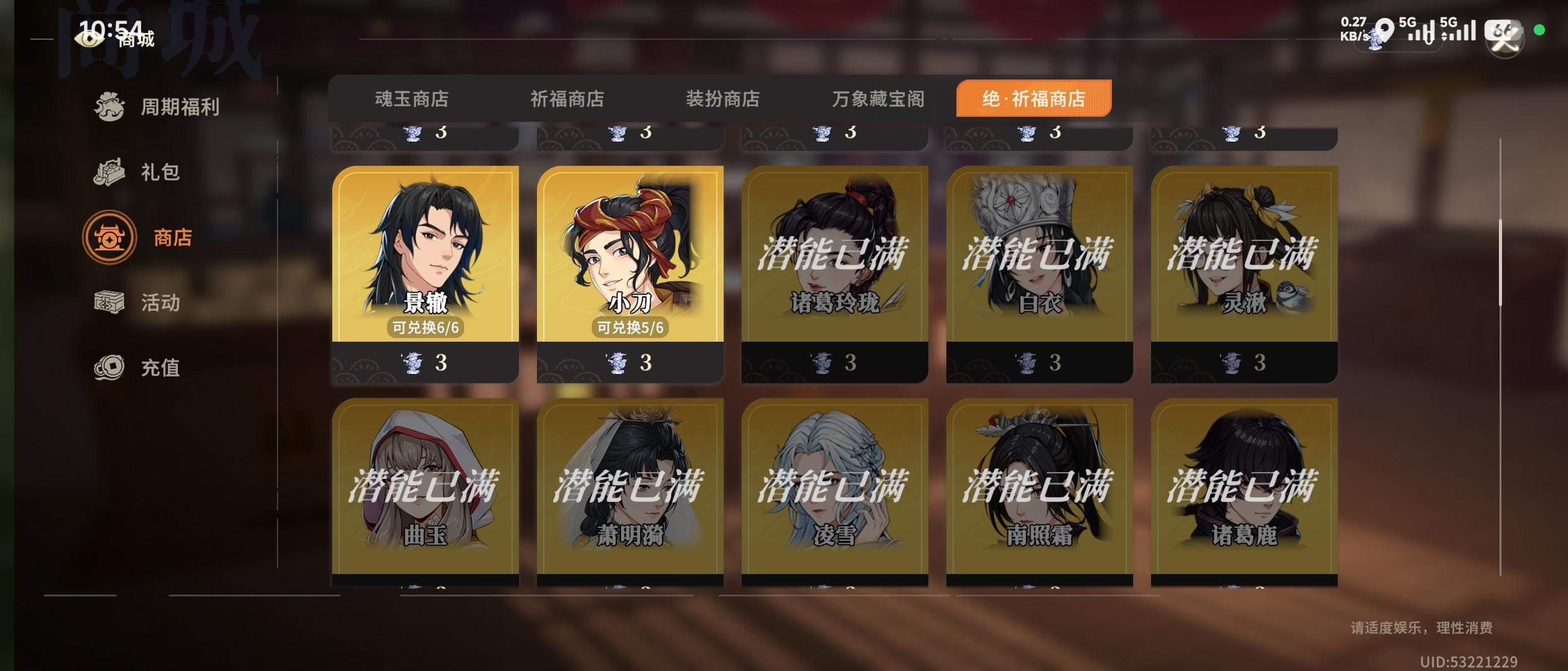 诸葛鹿up那会,本着有男不抽的原则没有下池子,然后就是改版,背刺,成了执念。吴渊来了,第一时间下池子,结果,又是背刺。请问,这种背刺还要来多少次?罢了,清了囤的资源,普池捞满了诸葛鹿,算是画个句号。闲鱼,启动!