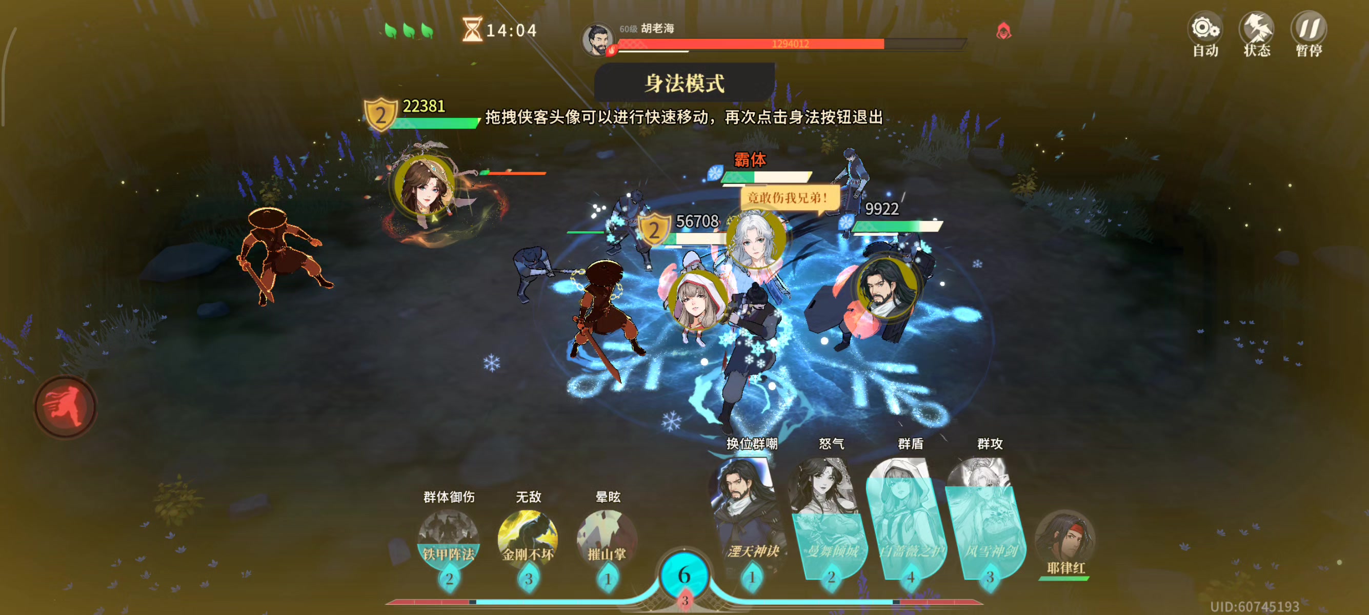 昨天还死活过去老五,今天简单多了! 老一:注意晕蓄力,别让他跳起来! 老二:霓裳混乱好,野驴拼输出! 老三:注意变身前换上曲玉加好盾! 老四:击杀顺序本体、紫、红、白,注意走位躲技能和锁定要打的怪!nv 老五:没压力,注意晕好蓄力就行!远程走位躲好技能!