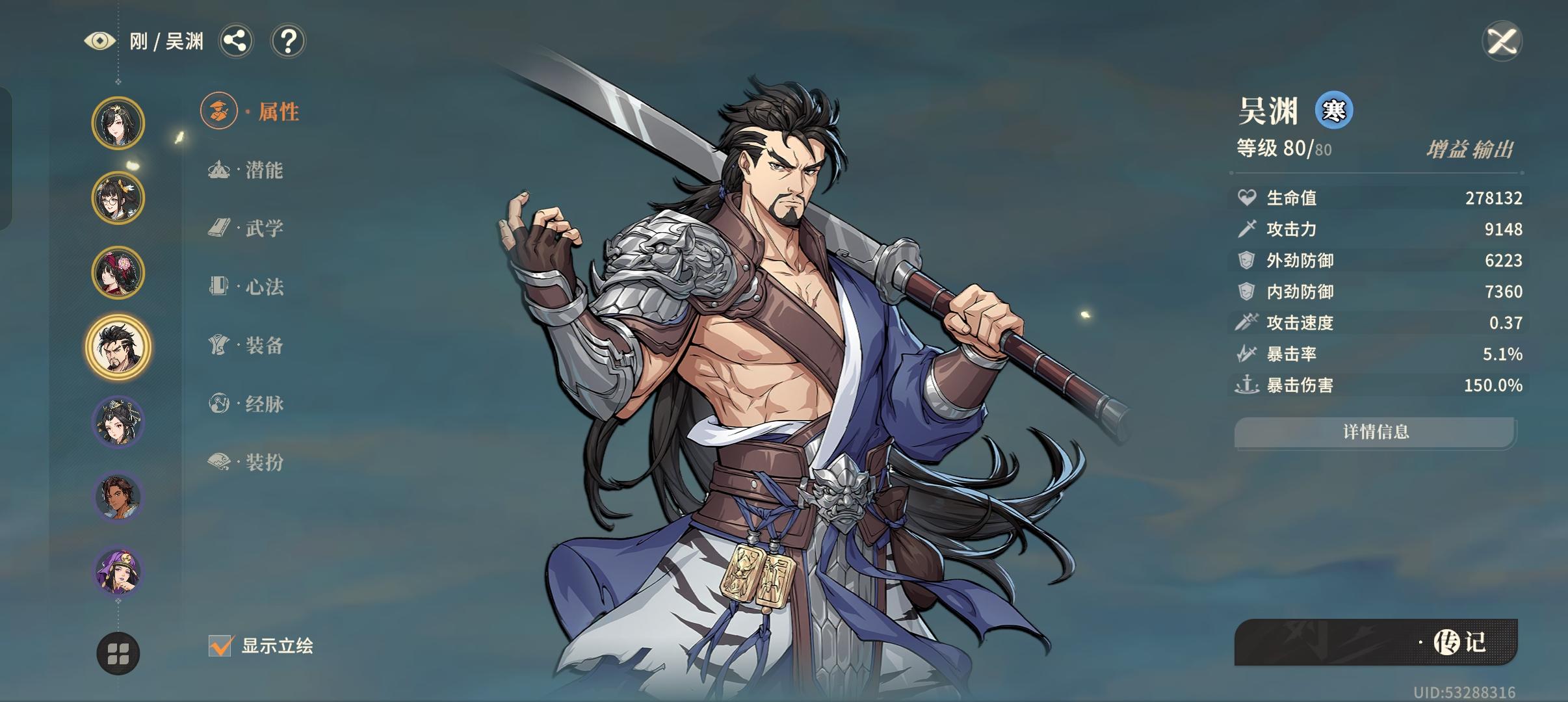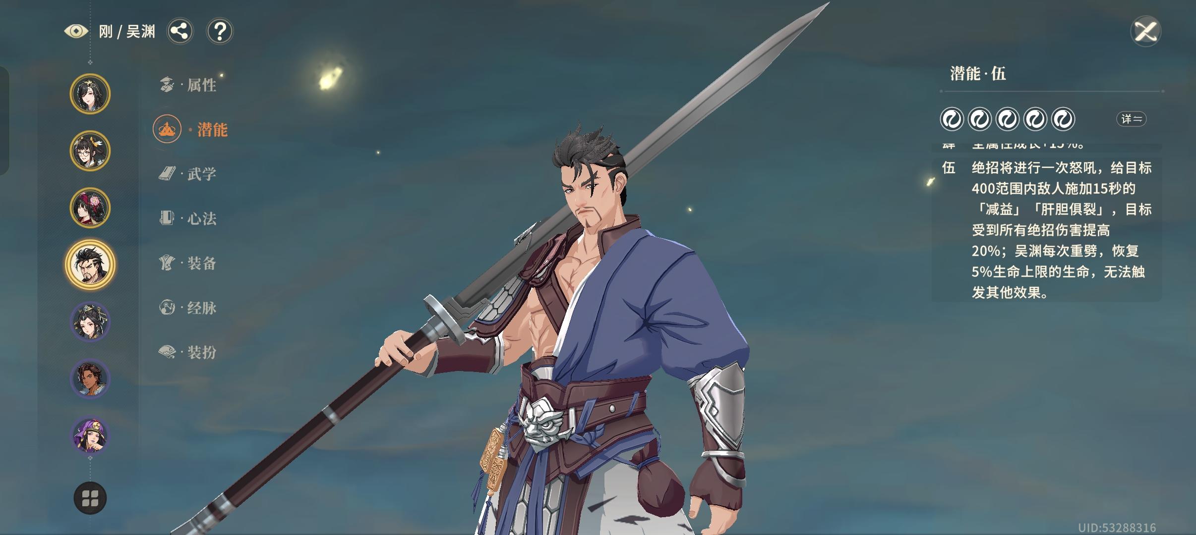 伤害量较调整前提高100%以上,配合上重劈超绝5%生命上限回血,更新后听从策划的安排,一手输出吴渊大师本老三实测,野驴死了他都没死,又肉(是真的肉,就是没嘲讽拉不住boss)又能输出。 有了吴渊,相当于你省了藏锋积锐、万剑穿御、醉酒狂歌、叱咤狂熊这四张策略卡,这么强还不赶紧抽
