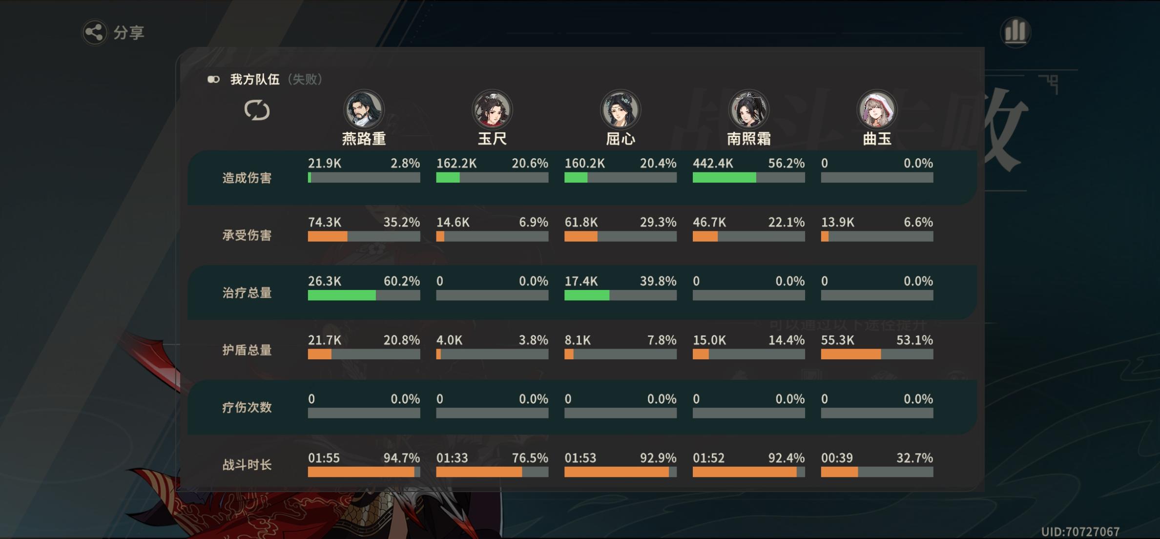 成长之路还有一天,感觉过不了了。黑白剑使打起来很烦,才打完五级。黑的打很久打不动,一不小心白的就死了,黑的血又满了。醉花荫的boos,满潜的南照霜磕药一个都打不动。。。。为了追等级,每天都买体力,松果也全部用完了。就是这么乏力日常大概是南照霜+燕路重+屈心+曲玉打输出会把曲玉换成玉尺