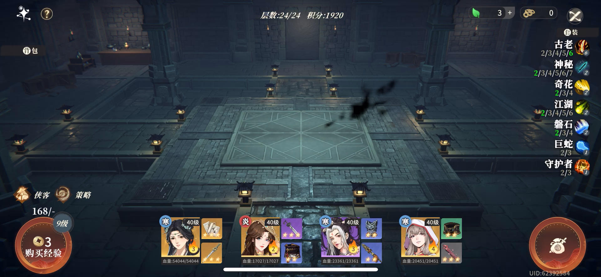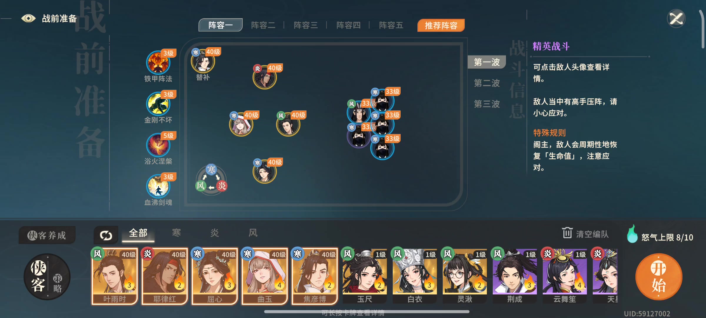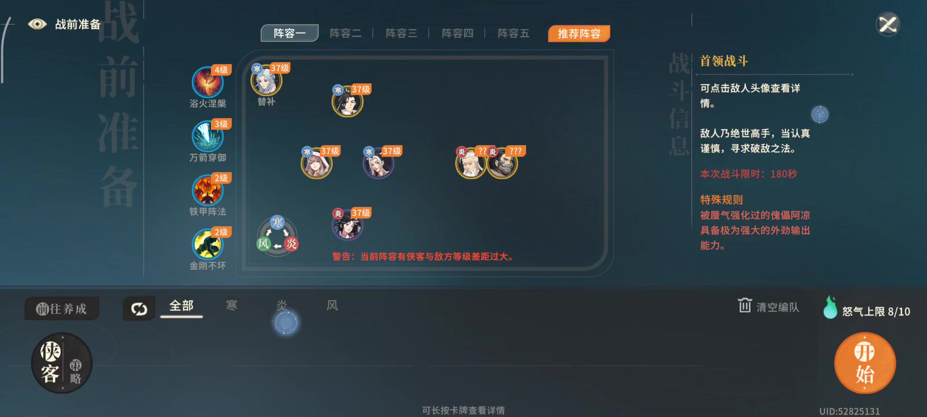 主线过了再去挑战强敌属性高得多了所以打不过了我直接说思路打法吧,保证每个人都可以过。 首先我等级是42留抽,所以主力高潜角色只有凌雪,这boss比较特殊没外功角色是很难越级攻破的,所以不能像我之前攻略那样用凌雪内劲强攻了。这里我直接启用了送的玉尺和一个紫卡阿曼莎,0潜即可,脉开到四就行,平民都可以抄。装备看我视频。 由于我没录到全屏打法录像我直接口述。 刺杀凌雪场下,阿曼莎峨眉,玉尺加攻高心法即可