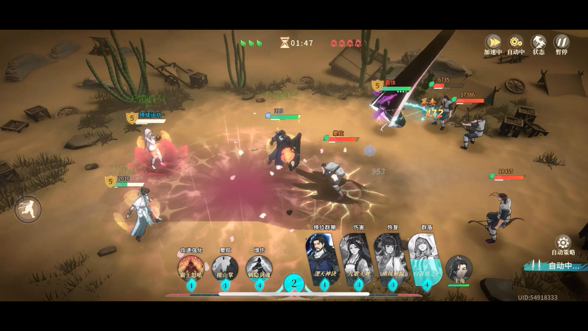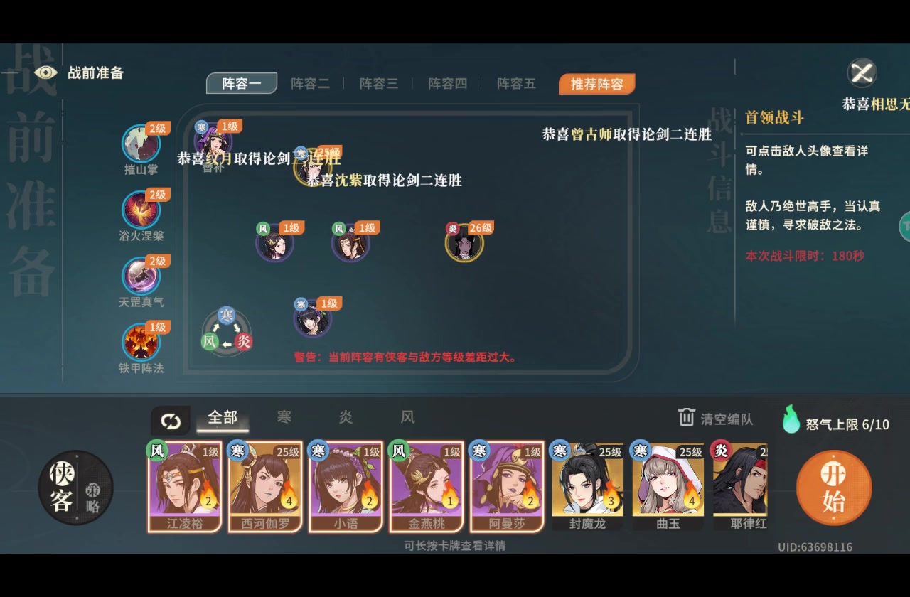 [表情_举手]开局上霓裳上混乱,让黑白剑使互相伤害。 [表情_举手]然后输出集火输出黑剑使,黑剑优先打死。 [表情_举手]黑剑使防御高全屏伤害要优先击杀。 [表情_举手]阵容推荐: 霓裳:混乱控制 小六:加血 任意两个输出。