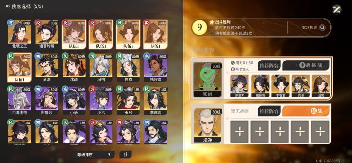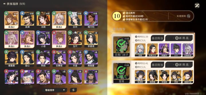 老一,感觉硬打还是打不了,最后是用论坛中溜字决溜死的,人多了还不行,就剩1个或者2个,反复用轻功跳出那个攻击圈,等他流血慢慢死,,,这种打法不需要练度,我只有南照有练度,剩下都是凑数的,基本心法都不带那种,,,,,,策略可以带金刚,铁甲之类的,容错率高点(忘记截图了)老二,这玩意之前头疼,因为锤妹要打老三,老二这边大范围火弹直接团灭,这次解放锤妹,用金燕桃加小6双驱散,全屏攻击时,放锤妹大招,生