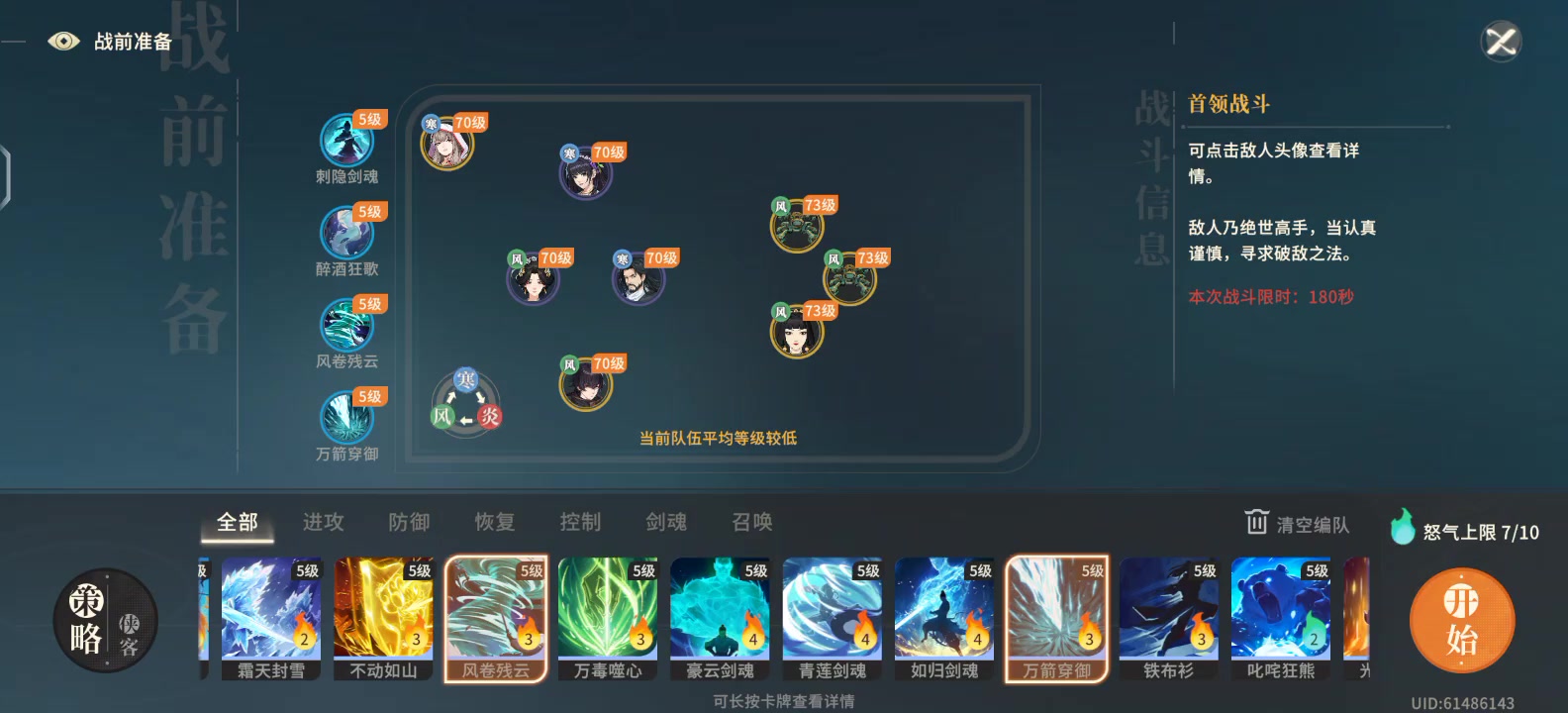 先说结论,PVE挺强的,和南互补,视频里面是我56级打精英风雪的最后一个boss,破御很快,本身可以不需要带t,有点像内功版的屈心,但是PVE比屈心强,需要暖机,暖机完成以后伤害很高,带吸血剑,只要不被秒就能吸回来,功法带猴子,从视频里面最开始普攻3000到后面暖机完全体以后普攻1w,而且还是多段伤害,叠万箭也很快,非常刚需剑魂,所以费用很缺。 再说配队,池鹭是必须的,诸葛基础攻击太低了,池鹭加攻
