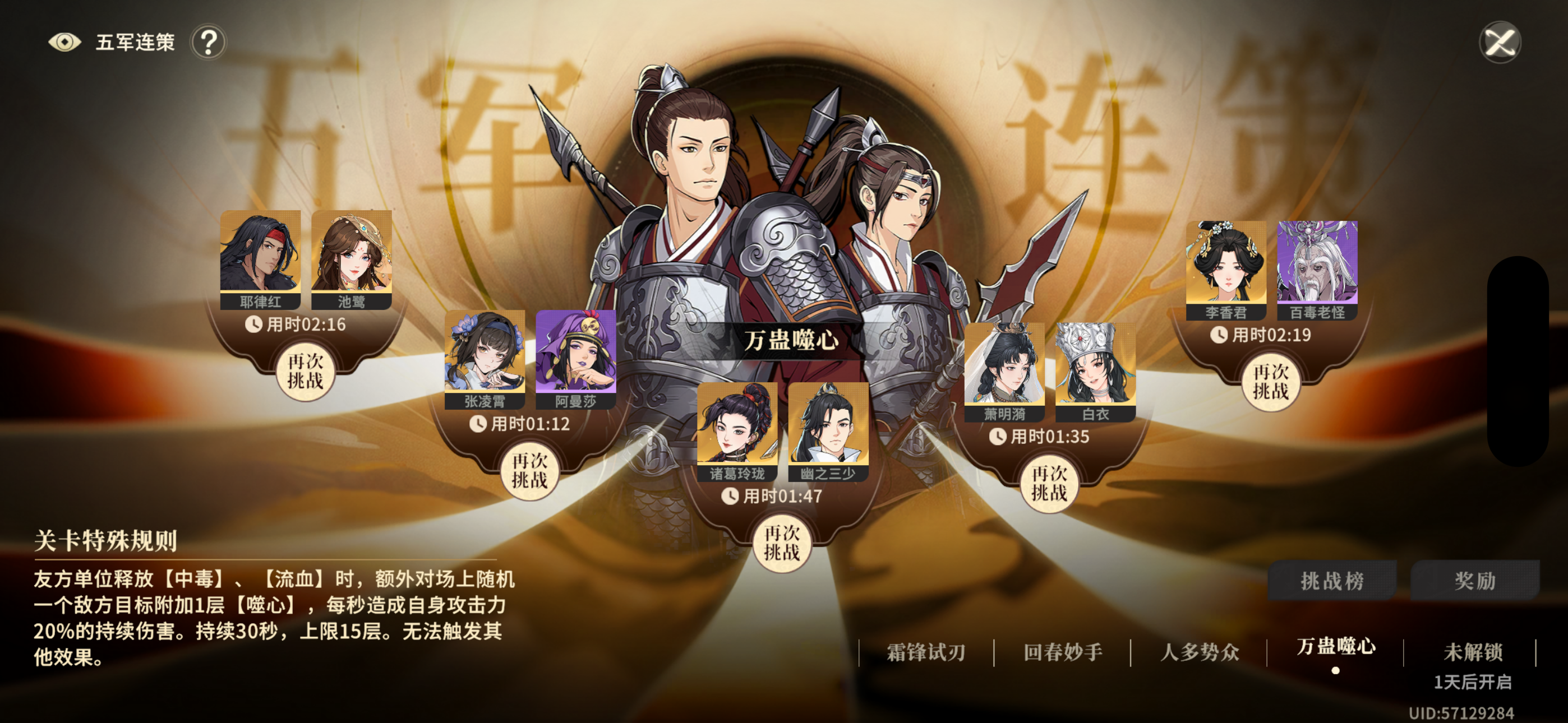 五军第四天任务,毒毒毒还是毒,主角普通选毒,技能选毒,任意一个血多点的加一个毒轻松过,卡选择万毒和迷风剪影,我把老怪升到了60级就轻松过,给一些简单装备,带万毒心法,祝大家都能过关