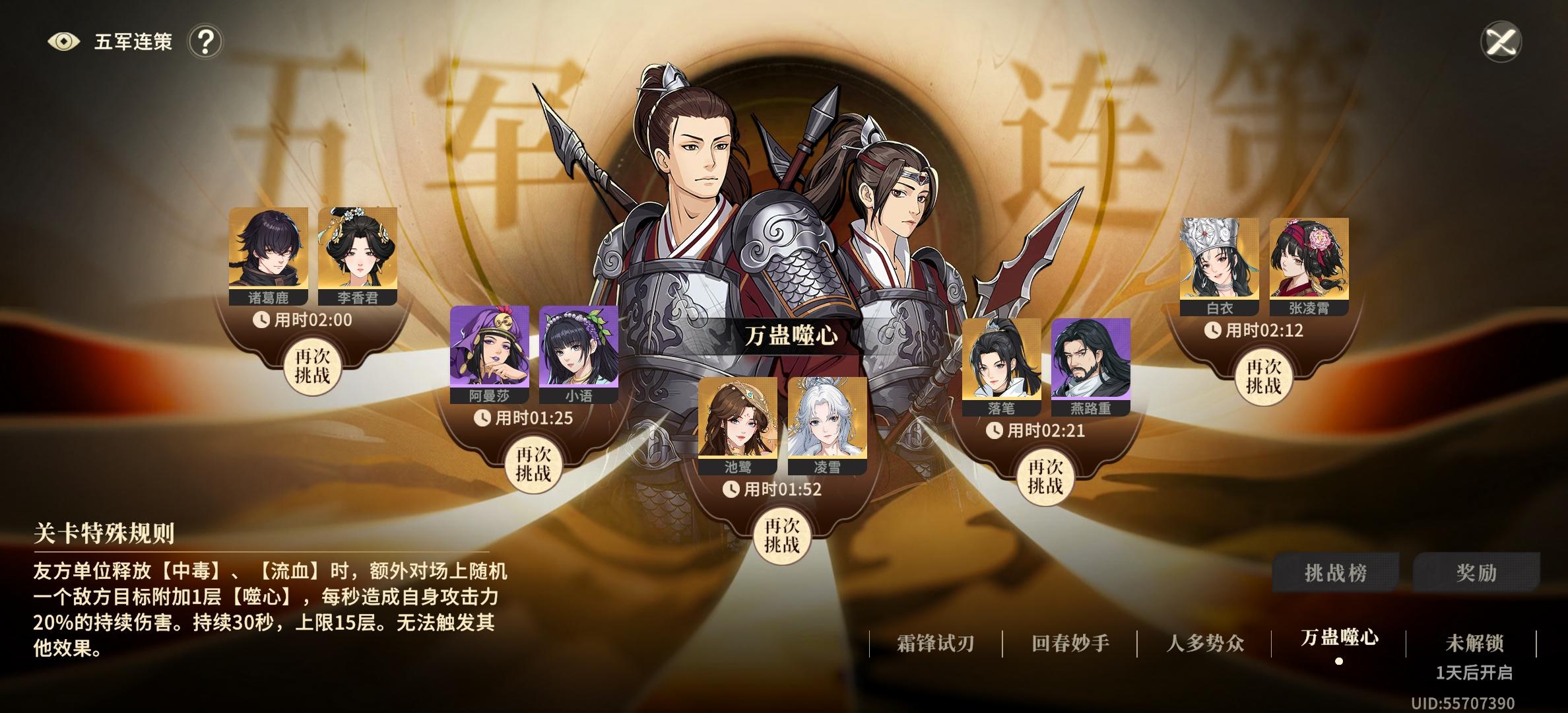 五军第四天任务,毒毒毒还是毒,主角普通选毒,技能选毒,任意一个血多点的加一个毒轻松过,卡选择万毒和迷风剪影,我把老怪升到了60级就轻松过,给一些简单装备,带万毒心法,祝大家都能过关