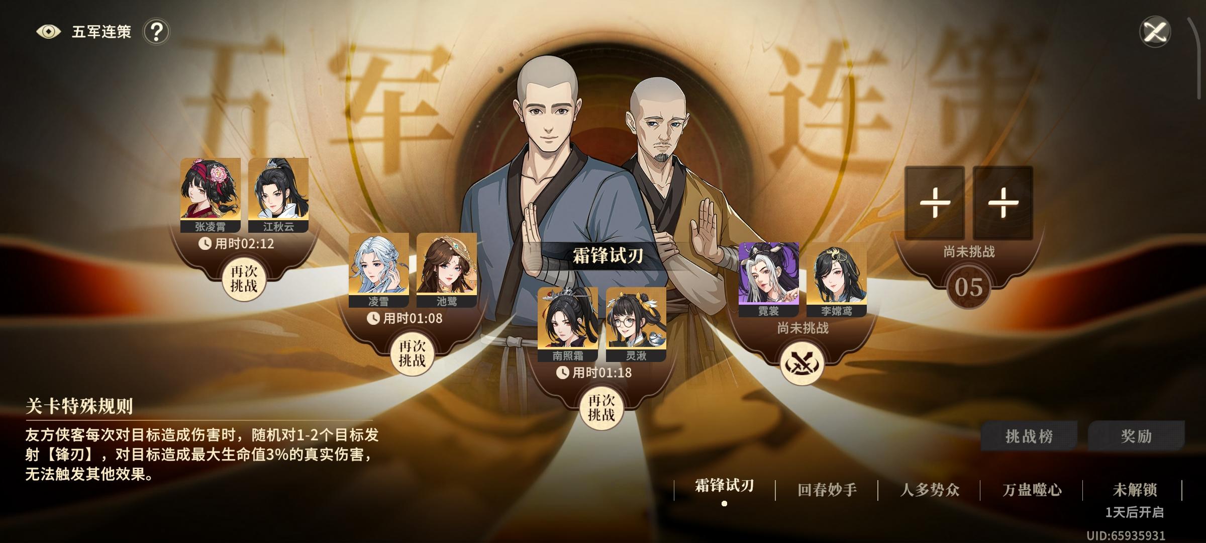 我不知道你们到底想设计什么样的游戏,那个五军连策难度高的吓人,打了几个小时,已经把自己打自闭了。这活动简直比至炫之境那个深渊还难十倍,数值要求高、策略性要求高、阵容box宽度要求也高。其实我一开始就猜到这个活动可能是给氪佬准备的,需要抽很多侠客来应对各种环境,需要很深的角色池,做好了心理准备。但是当我试了近一个小时,用1潜李嫦鸢试了各种方法,还是没有办法打过对群关的时候,我还是觉得很无力,数值