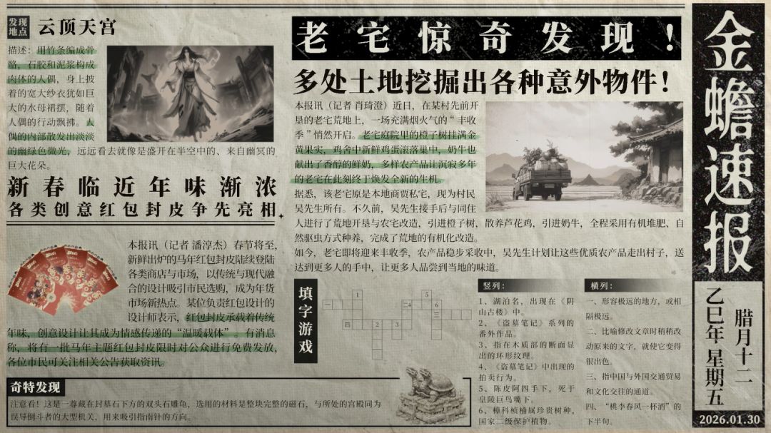 🔍 预约游戏🔍 加入Q群:号外!号外!《盗墓笔记:启程》金蟾速报栏目为您带来杭城最新最热的独家快讯!【本期看点】· 雨村老宅荒地变牧场,牛羊鸡叫添新乐!· 湖滨路潮流饰品店盛大启幕!欢迎四海来宾!· 全新考古发现!西王母的爱恨情仇……?…………更多快讯,就在金蟾速报!(P.S.预约游戏,订阅本栏目,锁定最新资讯!)【本期有奖活动——填字游戏】即日起至12月12日,根据报纸中