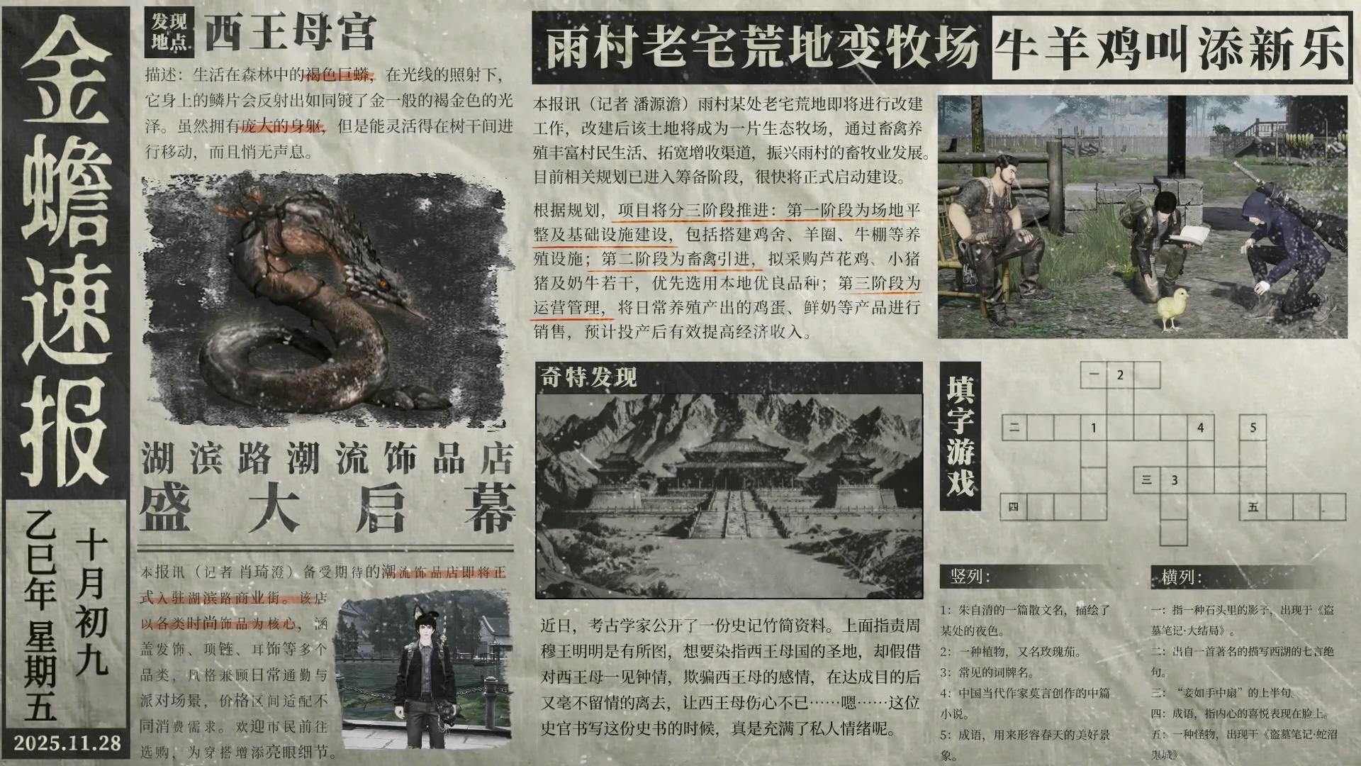 🔍 预约游戏🔍 加入Q群:号外!号外!《盗墓笔记:启程》金蟾速报栏目为您带来杭城最新最热的独家快讯!【本期看点】· 雨村老宅荒地变牧场,牛羊鸡叫添新乐!· 湖滨路潮流饰品店盛大启幕!欢迎四海来宾!· 全新考古发现!西王母的爱恨情仇……?…………更多快讯,就在金蟾速报!(P.S.预约游戏,订阅本栏目,锁定最新资讯!)【本期有奖活动——填字游戏】即日起至12月12日,根据报纸中