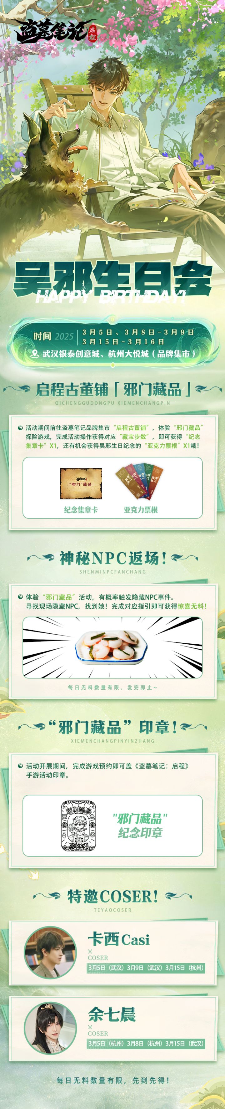 🔍 预约游戏🔍 加入Q群:惊蛰春雷动,万物启新章,小三爷生日即将到来,《盗墓笔记:启程》即将闪现武汉银泰创意城与杭州大悦城,与各位稻米们一同为小三爷庆生!“启程古董铺”限时营业,体验“邪门藏品”活动,获取限定亚克力纪念票根!另外,现场将有两位coser与神秘NPC带来更多惊喜!初春三月,我们一同相约见面吧! 活动时间:3月5日、3月8-9日、3月15-16日活动地点:武汉银泰创意城、杭