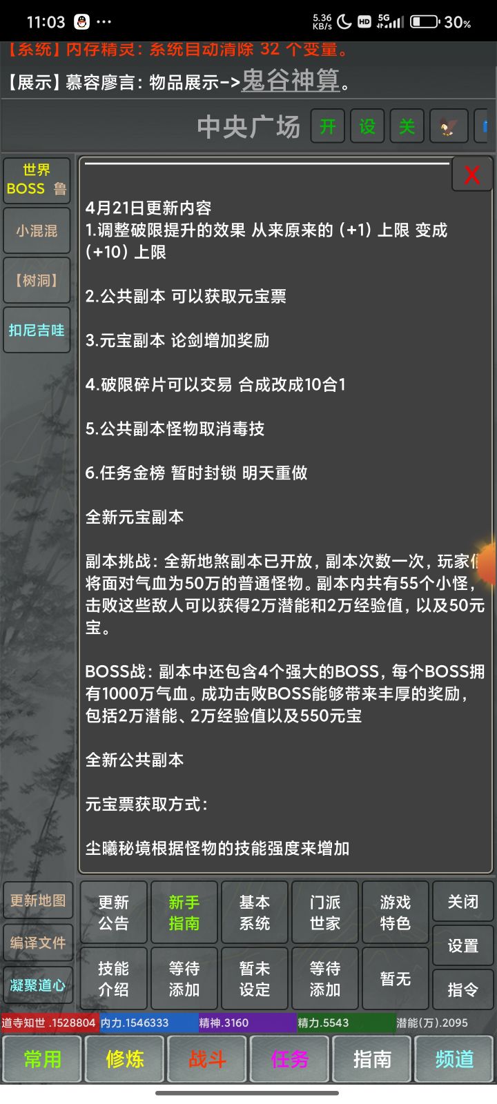更新1.周年庆活动开启持续时间半个月周年庆活动诸子百道●纪元庆典周年庆期间赞助比例1:1000周年庆期间所有副本掉落(春节期间系统会开启这个活动有模板你找一下) 集字 所有副本怪物随机掉落字 诸,子,百,道,纪,元,庆,典,福,利,放,送,等,你,来,拿诸子百道 纪元庆典 福利放送 等你来拿集齐诸子百道*1 纪元庆典*1 福利放送*1 等你来拿*1可以兑换500元宝(兑换限制10次)