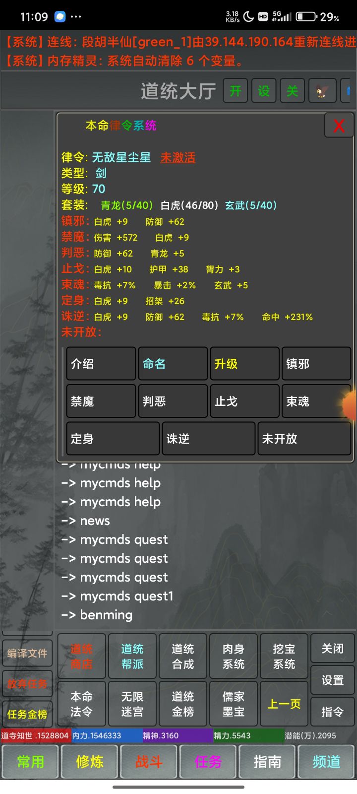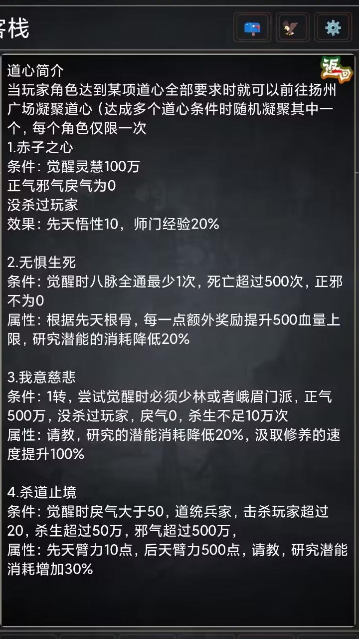 ⭐特色玩法:⭐五行系统(已完成):提升玩家之间战斗需要注意的细节,使激发同样武功的玩家战斗也会有一定差异化⭐气运系统(已完成):玩家出生之后,可以在扬州广场获取属于自己的天生气运,气运有着各种各样不同的作用,对玩家的成长有着巨大的作用⭐道心系统(已完成):在玩家达成条件拥有道心之后,能够进一步提升某方面的属性,使玩家在游戏中玩耍的时候有更多的流派走向,并提高一定发育速度和战斗能力,以上所述具体