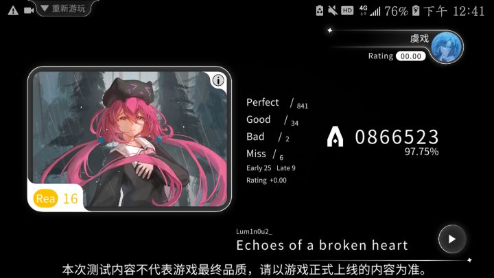 仅个人观点:(注:我曾经有玩过一些音游,会有一定的基础,感觉他跟屁股肉很像)①判定较严,判定线会动,有时也会随着节奏抖动②极其容易断触,特别是滑动音符,一般连续三个时中间那个总是断触,其他普通的音符也会③会有些卡顿,跟其他上市的音游对比,无论是音符下滑肘,还是在游玩时打击音符,都感觉有明显的延迟,不是特别流畅(仅为测试评价,一切皆以正式上线为主)总结:比较适合有一定基础的音游玩家,判定较严,容易断