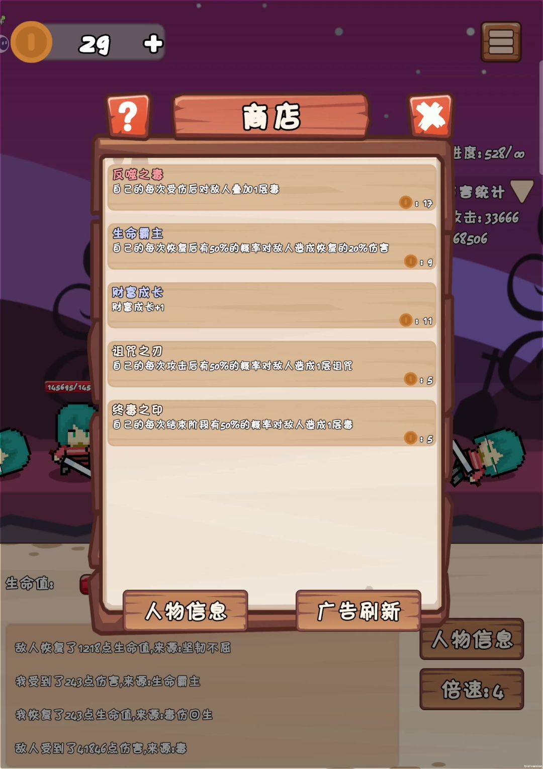 毒刺无敌 核心 涂毒匕首(前期叠层数)+剧毒之刃(关键输出)+剧毒药剂(100+关再叠起来都行)+毒伤回复 500关左右属性:剧毒药剂战前叠100+,一击百万,三连击基本一路秒杀