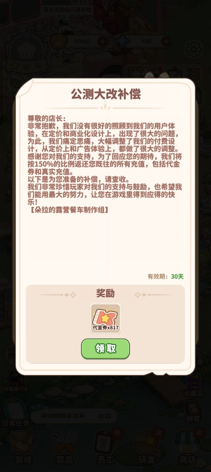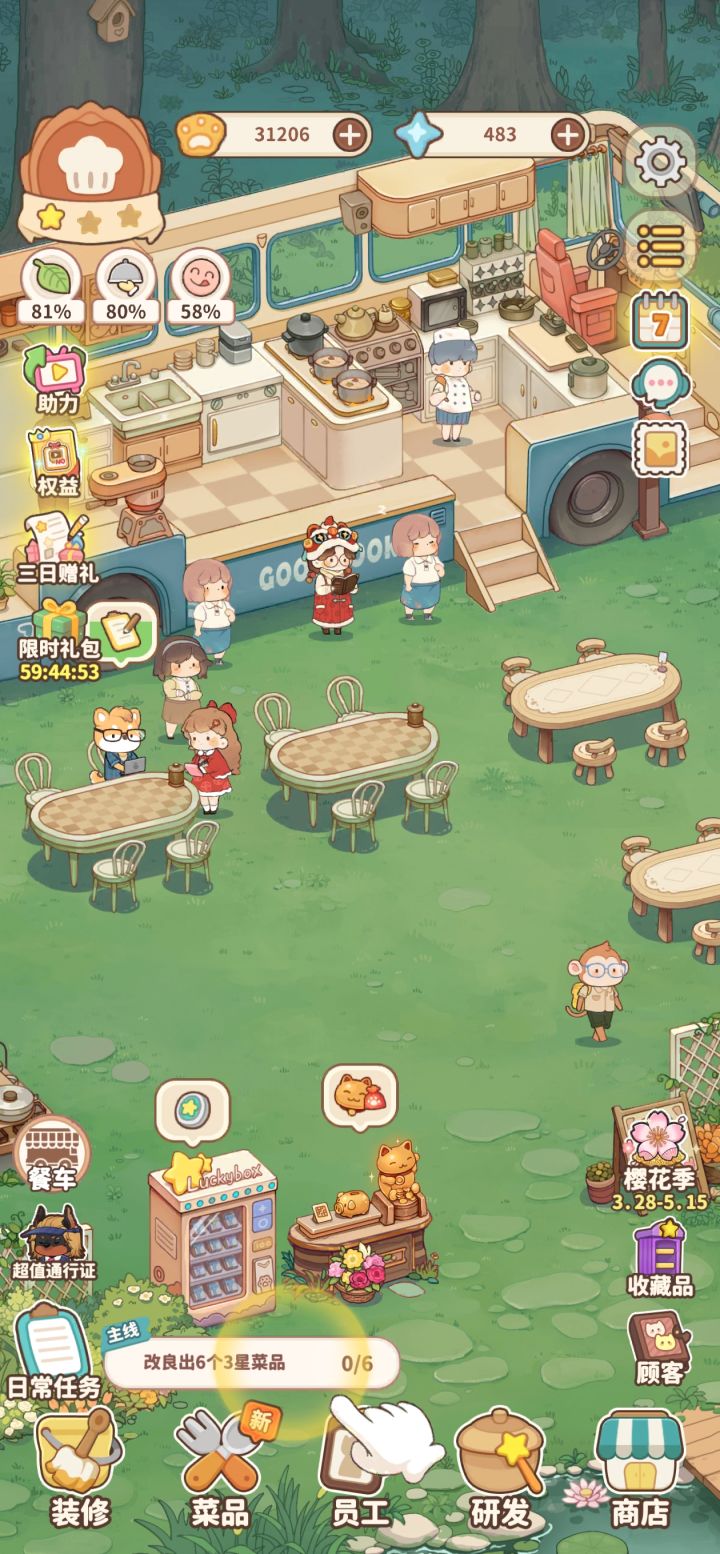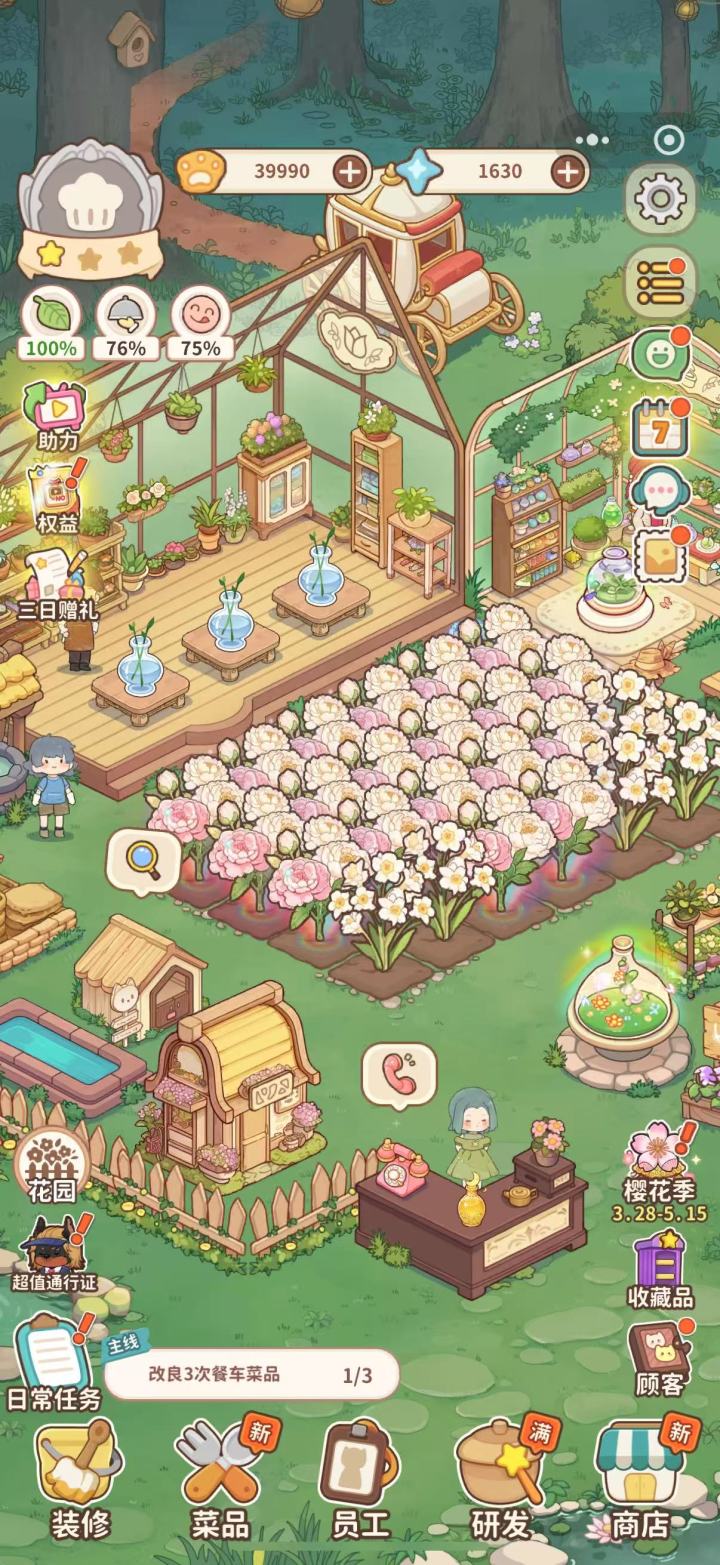 玩法是简单的模拟经营,主要有三大类:开餐车,开烧烤摊(还没体验到),开花店和附带的合成玩法等等,合成不是类似肥鹅这种(抱歉没有说鹅不好,只是个人觉得很无聊不喜欢)。