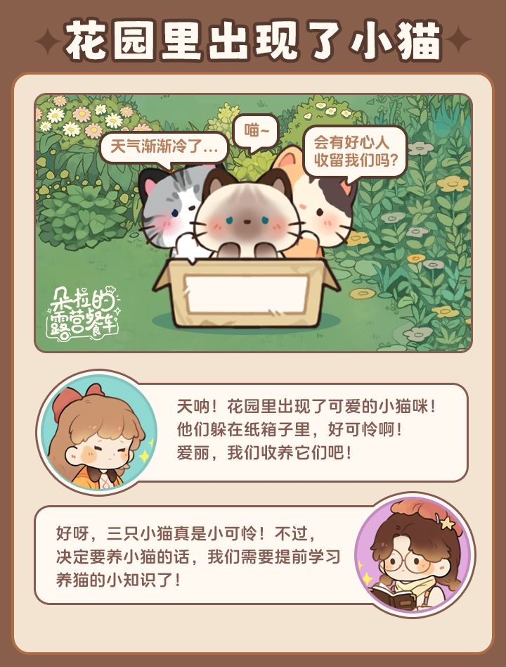 朵拉的露营餐车猫猫玩法更新啦,浪花测试也同步开启啦!!10月15日开启测试哦!!欢迎大家继续给我们提意见,加入我们测试群哦~10月17日会在发一些测试资格哦,没拿到测试名额的小伙伴不要着急哈!!🐧🐧🐧企鹅群:859171304领养喜欢的猫猫吧,有活泼的三花,傲娇的虎斑,粘人的暹罗。