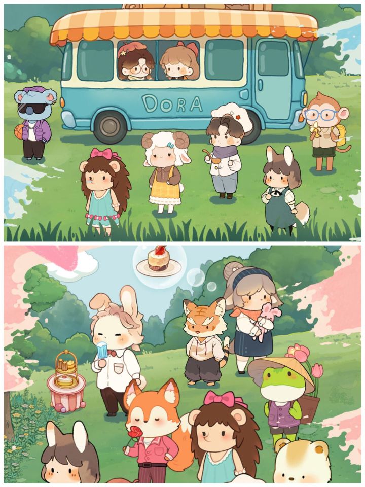 #朵拉的餐车剧情续写比赛 憨憨,绳子又打结啦!” 米粒躲在树后喊道。憨憨踮脚挂灯笼,一个踩空,竹灯笼 “啪嗒” 摔裂了尾巴。他涨红着脸道歉,憨憨垂头丧气的。总想着证明自己,却总闯祸(上周贴反海报,三天前拿错酒害得威廉连夜补救)“我是不是只会闯祸...” 他踢着石子嘟囔。威廉端着鸡尾酒路过:“多亏你搬的山泉水,‘晨露青柠’好喝多了!” 奇奇递来新竹骨架:“按你喜欢的来糊纸。”篝火亮起,憨憨