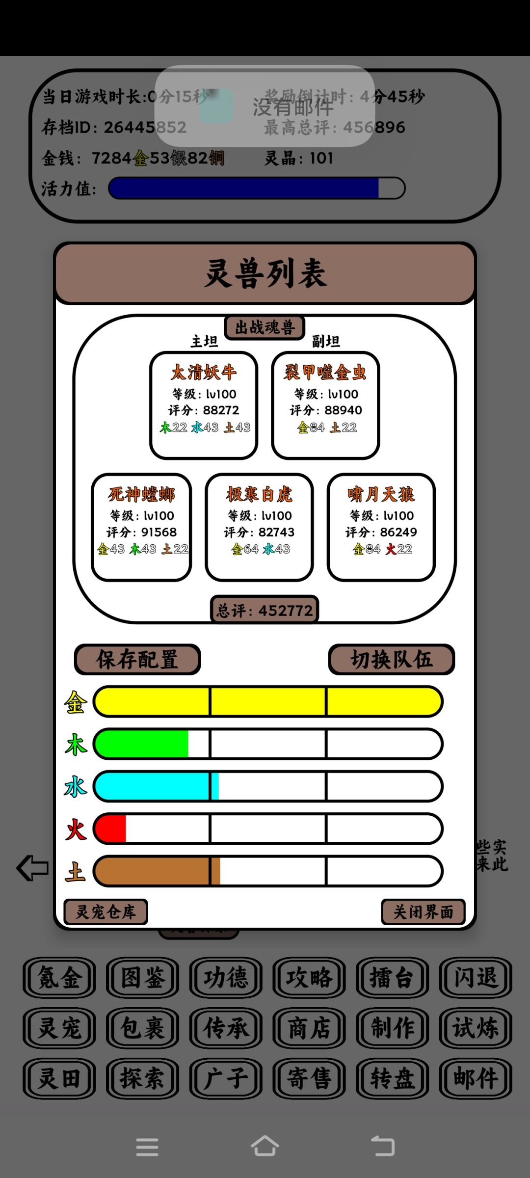 进入游戏,点攻略→兑换码,输入ljyx520领取新人礼,在背包开袋子和装备匣。 先说宠物 一队(挂100级的图) 主c(雷霄云纹兽/火龙),凑三金三火,基本强化满装备就能一波。 二队(前期主力) 主c(风狼),一号副c(风豹,buff机和单点收割),二号副c(火豹,靠被动打伤害,不太吃装备),主t(乌龟),奶(鱼,狐,蝴蝶)。 三队(中期boss) 主c(螳螂,吞金),剩下三个看个人。 四队(后期