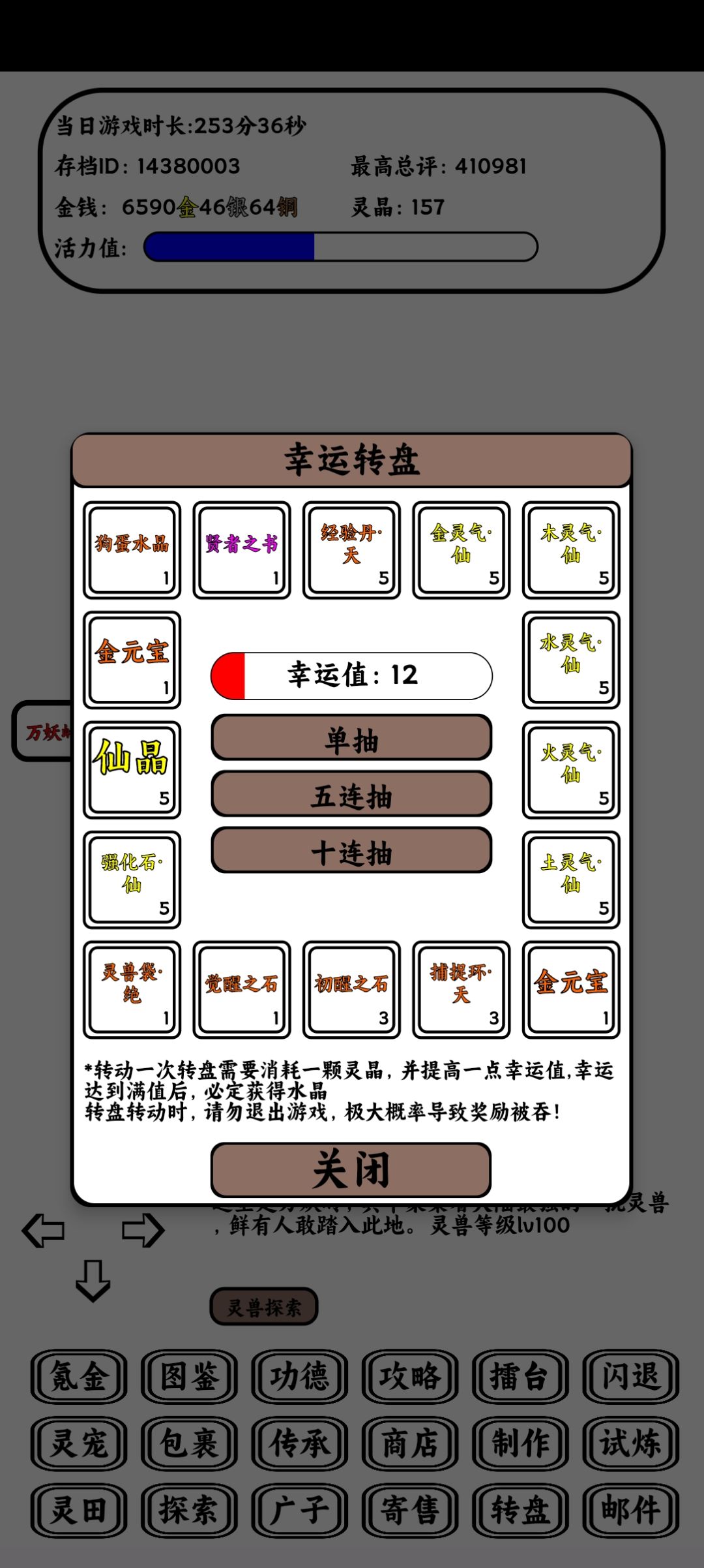 进入游戏,点攻略→兑换码,输入ljyx520领取新人礼,在背包开袋子和装备匣。 先说宠物 一队(挂100级的图) 主c(雷霄云纹兽/火龙),凑三金三火,基本强化满装备就能一波。 二队(前期主力) 主c(风狼),一号副c(风豹,buff机和单点收割),二号副c(火豹,靠被动打伤害,不太吃装备),主t(乌龟),奶(鱼,狐,蝴蝶)。 三队(中期boss) 主c(螳螂,吞金),剩下三个看个人。 四队(后期