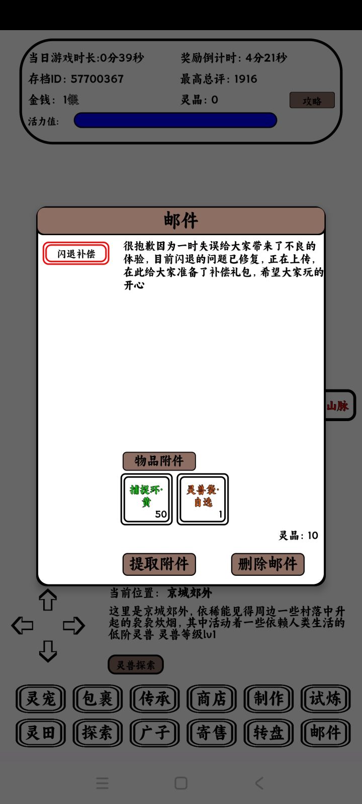 很很抱歉,因为一时的失误,给大家带来了不好的游戏体验,已准备好补偿礼包,在此前进行游戏过的玩家,可以在邮件中进行领取