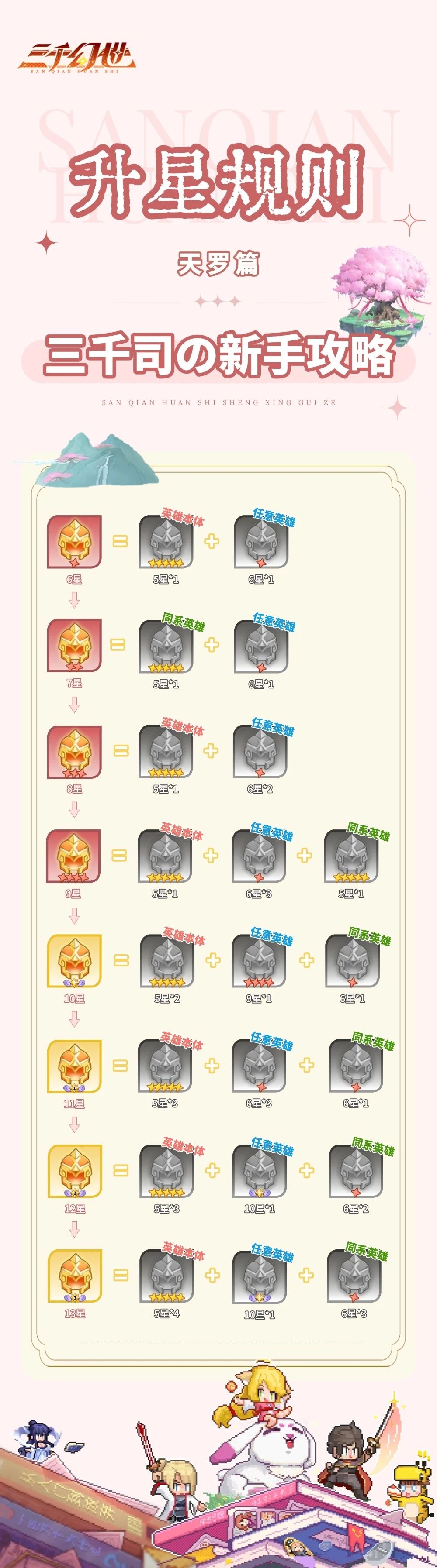 #三千幻世创作征集令 #三千幻世 一、角色升星 1.三系升星公式(仙灵、传承、异能) 四星→五星:同名英雄*2、同阵营4星英雄*5、同阵营3星英雄*4 五星→六星:同名英雄*1、指定同阵营英雄*1、同阵营5星英雄*3 六星→七星:同阵营5星英雄*4 七星→八星:同阵营5星英雄*3、同阵营6星英雄*1 八星→九星:同名5星英雄*1、同阵营5星英雄*2、同阵营6星英雄*1 九星→十星:同名5星英雄*