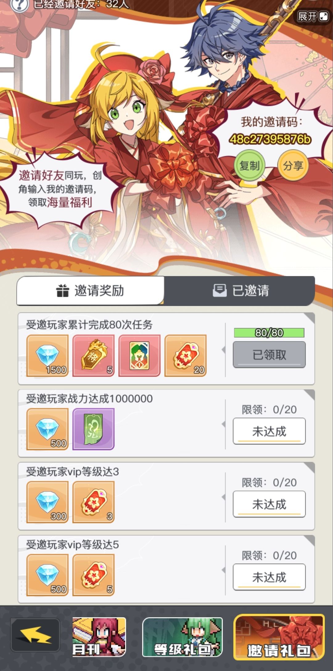 有空刷个好的开局:黄晓烟王依依白月初雅雅蓉蓉洛兰这些都是可以的,没空也没必要纠结,养成游戏都是剩者为王,后面必然都会有的。 萌新如果新区玩,30级之前可以填一下邀请码(福利-拉到最后面),有奖励的:48c2739bc743 1.首先,千抽三选一,100次机会,刷到雅雅洛兰蓉蓉都OK看自己开局抽的英雄怎么样,一般建议都是选雅雅或者洛兰,也有其他自己选自己喜欢的那就看是不是真爱了 2.然后就是英雄商店