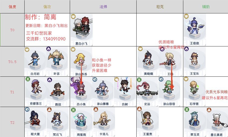 一、角色选择与养成策略 1. 核心角色推荐 开荒必练(三系过渡) 欢都落兰:单点爆发极强,平民首选,后期仍可搭配光暗队使用(可升10星) 涂山雅雅(升至9星即可) 曹青辞 卡洛儿 目前光暗系可养(都有基本的获取渠道) 光系:王依依(最强辅助10星觉5可越战)、白月初、黄晓烟、黑白小飞 暗系:王宝乐、叶言 2. 升星避坑指南 6星以下角色:蓝色角色保留作为紫色升星材料,分解会浪费资源。 高星