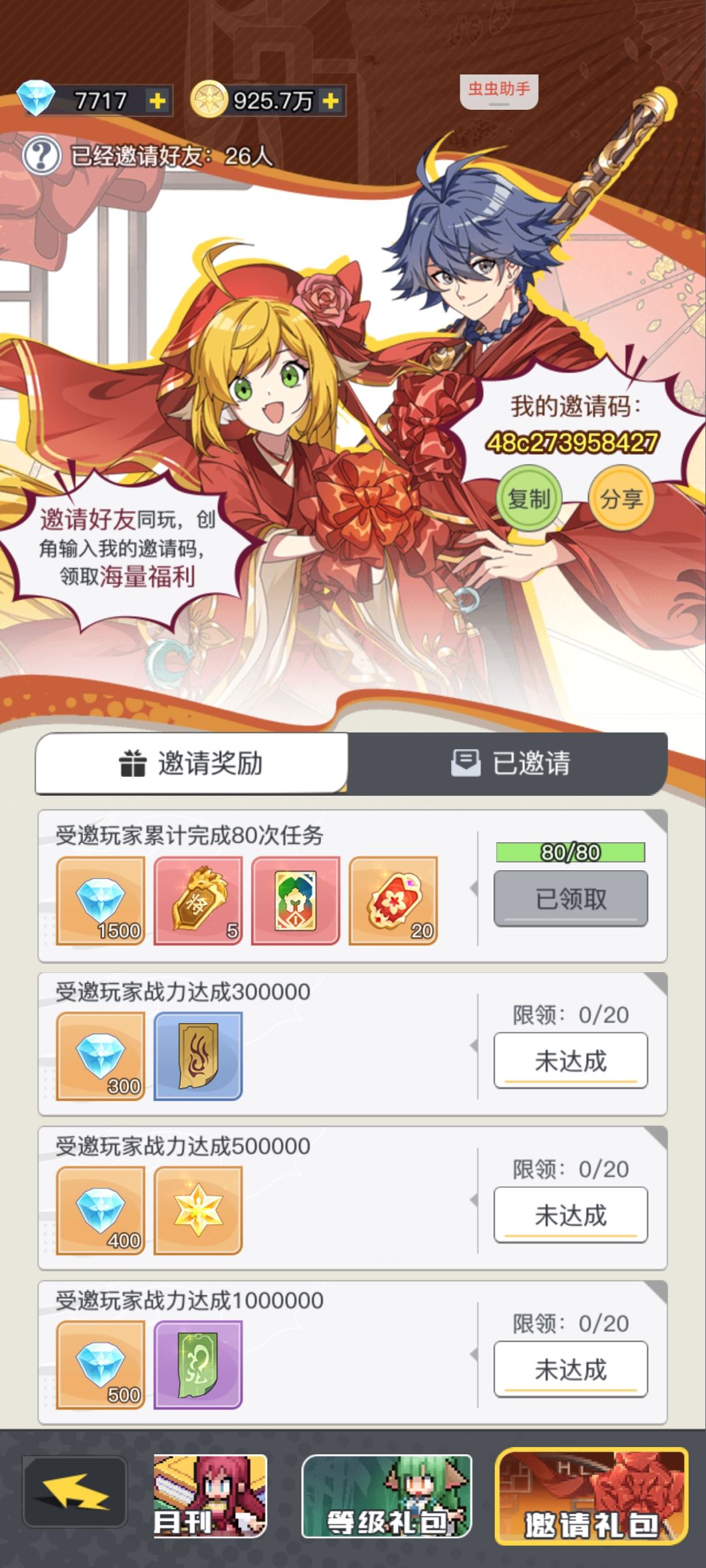 跟着进度到4级,点击福利拉到最后领取邀请码大礼包和邮件道具有50个道具去抽卡保底第一张红卡,继续跟着主线升到10级开活动界面全部领取50个道具继续抽卡,还有个千抽活动选中自己喜欢的红卡英雄,最好也是第一张红卡,这样红卡可以快速升星提升战力,前期用全体法师配合曹青辞推图猛,首冲党用雅雅就行了,均衡提升战力开日常副本,开区前几天每天金币和经验一定买满,这样才不会卡图 兑换码合集 邀请码:48c273