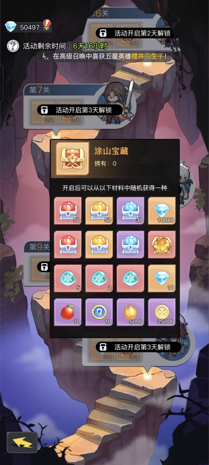 零氪第一天攻略零氪前期推荐雅雅、卡洛儿、落兰、曹青辞优先度最高雅雅(落兰完成任务会有一只,一千抽刷出雅雅和落兰别急着领取,先抽卡,抽到啥在领取相同的升6星)培养一只3技能5星的卡培养到9星,后续当狗粮升10星。第一天金币,星辰果全部拉满,不要影响进度和卡关(防止经验少)注意快速作战,卡的刚刚好,不要溢出(挂机收获会显示还剩几小时升级,列如还差两小时半升级,建议等半小时后再用加速,升级后立刻打新