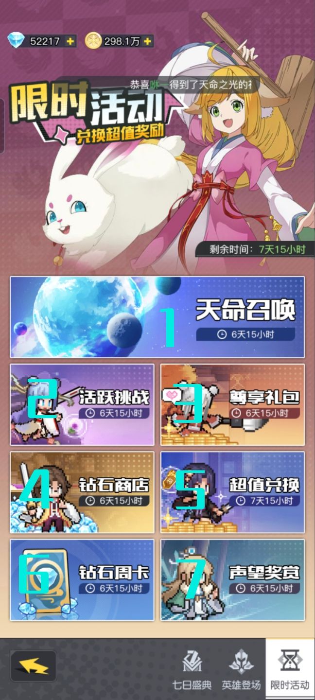(^-^)/*\(๑• ₃ •๑)4月17日开了三个活动界面,一个程大雷的挑战,一个黑白小飞up,一个是特殊召唤和活跃任务。p1:程大雷挑战活动,没什么好说的,每日任务+快速作战次数要求+英雄挑战,获得奖励抽大转盘,另外的是每日特惠礼包和累天充值。p2:黑白小飞up活动—— 1、天命召唤,每天免费一次,钻石2700十连,每天最多2次,保底120发,概率1.1%,池子里的其他角色和奖励概率见p