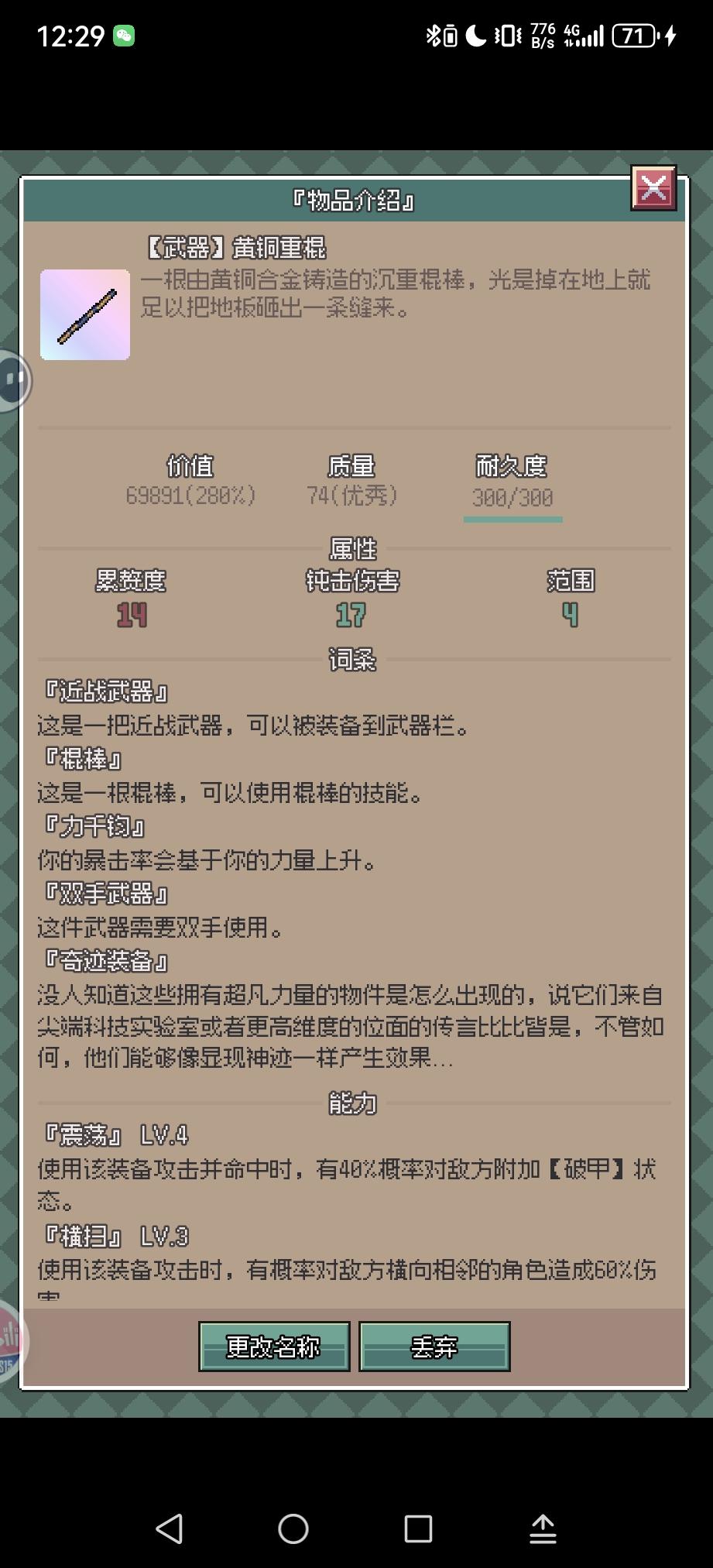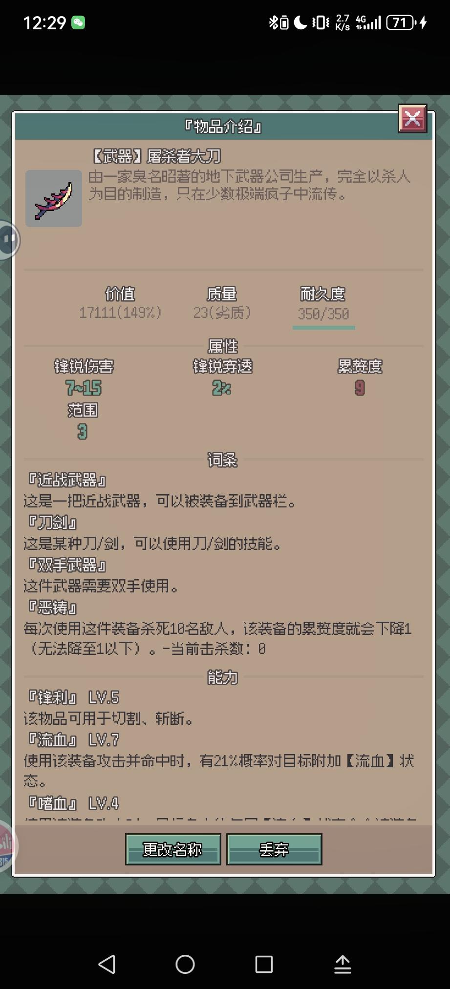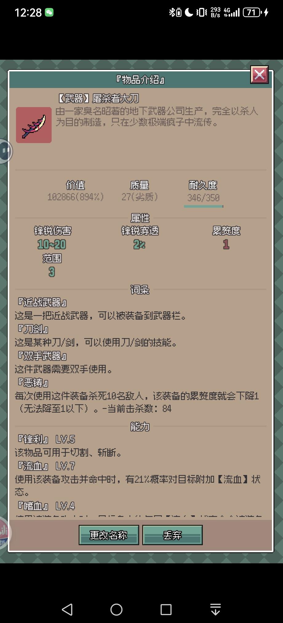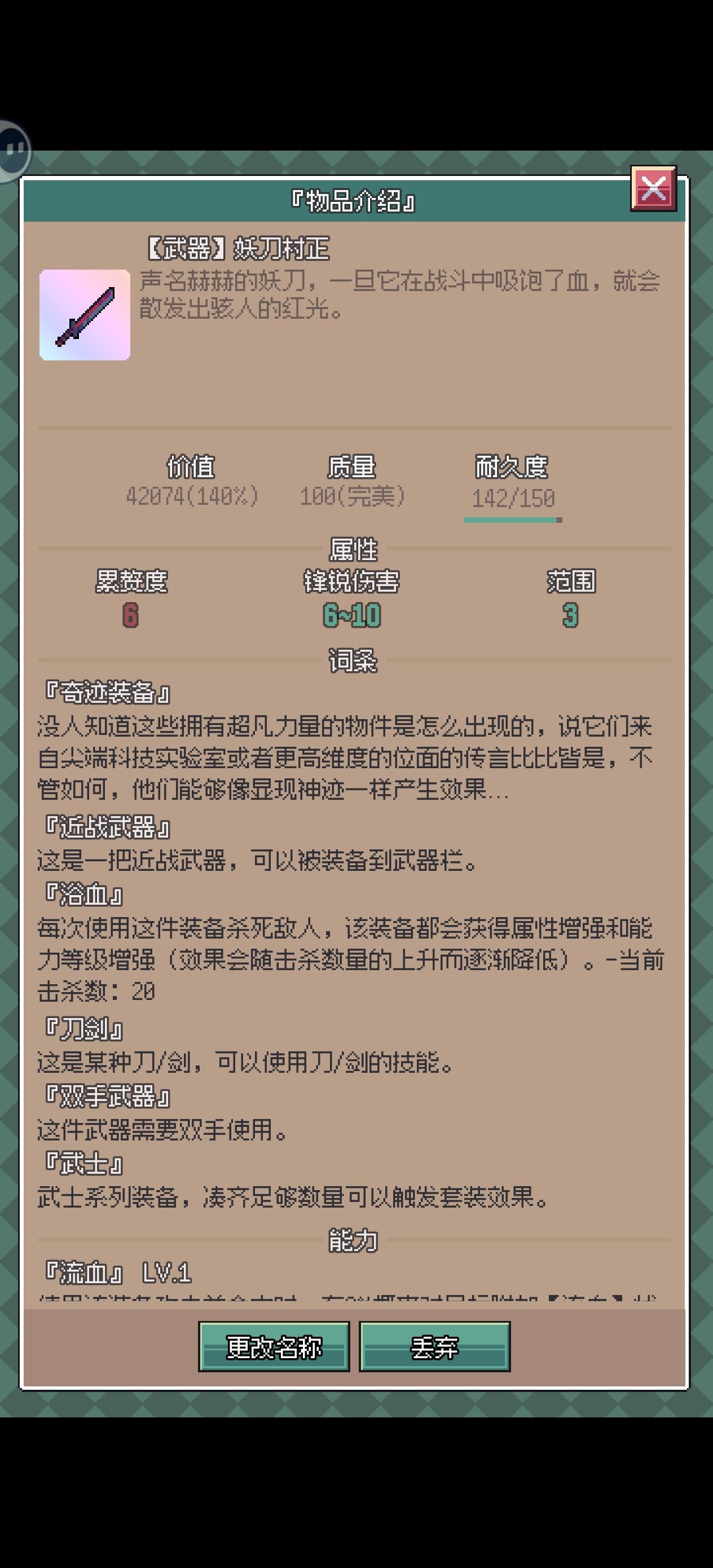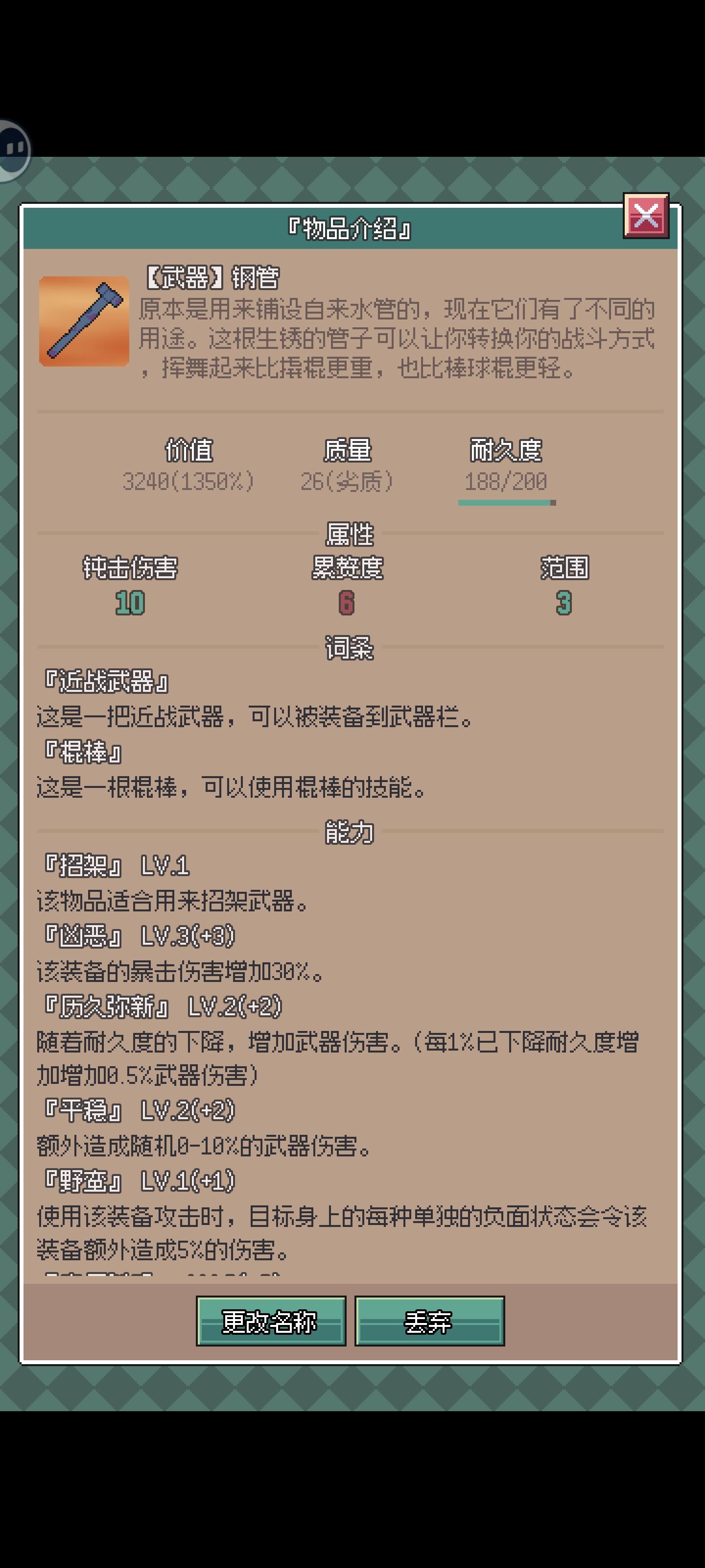 如题老登远离,不讲流程,只讲操作上的疑惑。一.武器装备,萌新前期3点行动点,打不过跑不过怎么办?行动点是由敏捷与累赘度共同决定,两点敏捷转一点行动点,所以前期装备尽量选高敏捷低累赘的装备。二.物品属性,长按背包物品即可查看物品的属性,例如水污水等液体,具有不可携带的属性,都需要容器才能进行携带移动(注:并非所有液体都有该属性,如草药汁即可随身携带,不知道是不是bug,所以了解物品属性才能更好地