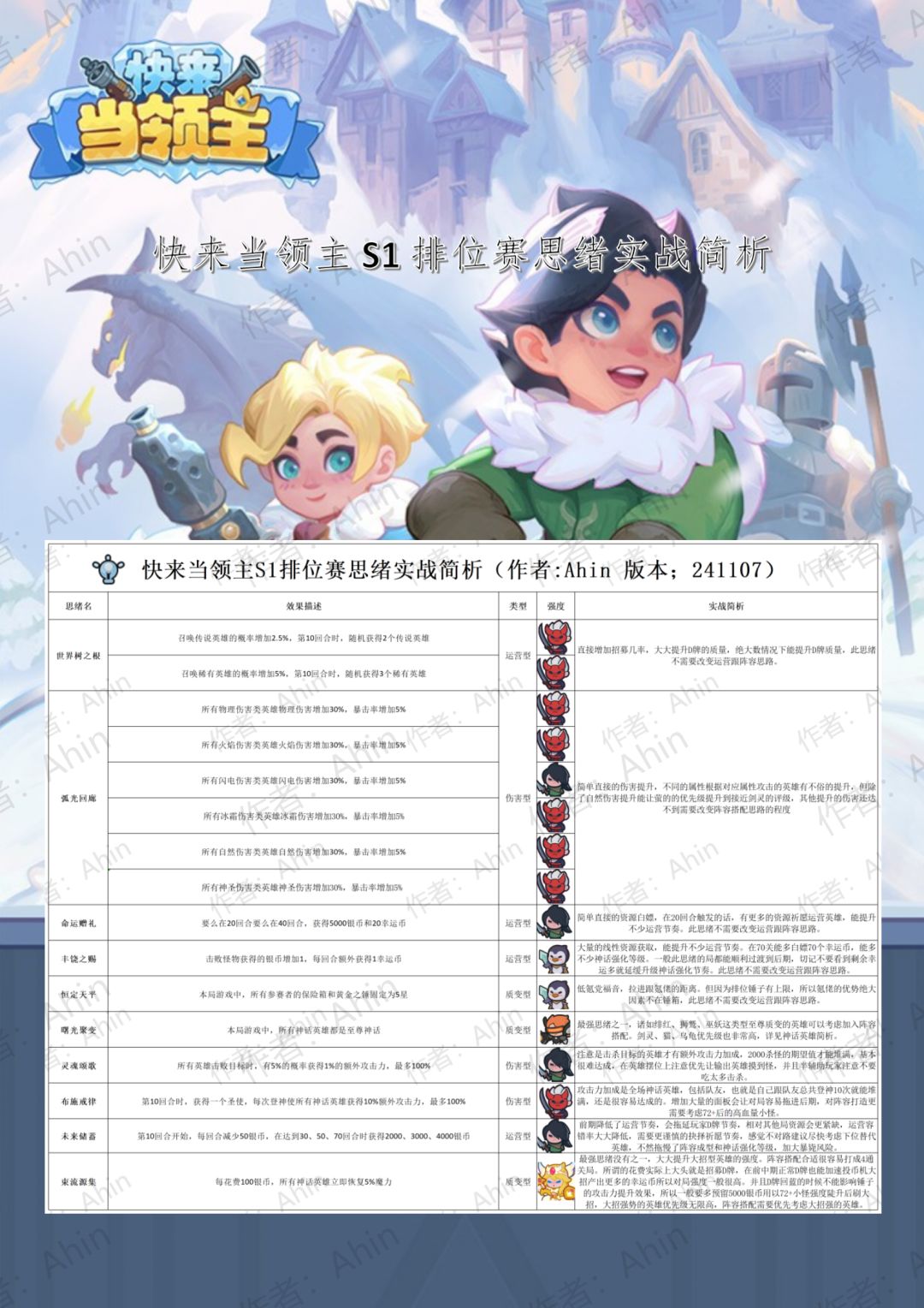 【排位赛高效上分指南】 【核心配置】 ▶ 门槛:4+3配置可冲宗师(例:15剑圣+12猫+12冰女) ▶ 低段位:钻石以下多打即晋级 【英雄优先级】 🔥必练主力: 15级:猫/剑圣(优先) 12级:刷币/妖精 🌱备选:冰女(水元素喂满)/莹(需收藏5+) 【标准阵容】 ▸基础模板:4刷币+2妖精+3-4剑圣 ▸进阶调整: - 高配:补2-3天使+剩余全猫 - 中配:补2冰女+剩余全猫 【特殊英雄】