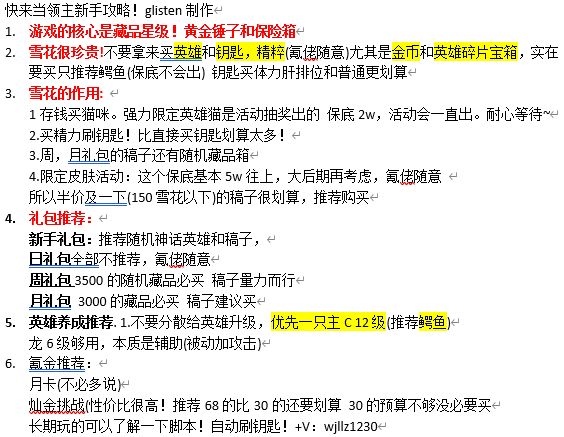版本日期:24.8.14 by乔不工 本篇作为之前攻略汇总的技巧补充篇,故强烈建议大家先看官方攻略版、萧尹的数据表及ahin、meat的开局攻略等。 一:战局外 1,入坑后的新人如果氪度较低,钻石主要靠日常拿的玩家,可以先不急着买“日礼包”的金钥匙。过段时间会开放“周礼包”、再后面开“月礼包”,一个比一个划算。 对于月卡、战令和首冲都买了的玩家,月礼包周礼包之中重要的金钥匙和冰镐是能够轻松买完的。