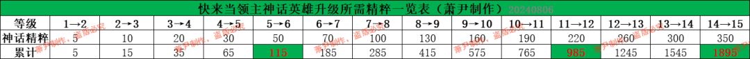 神话英雄升级所需精粹表