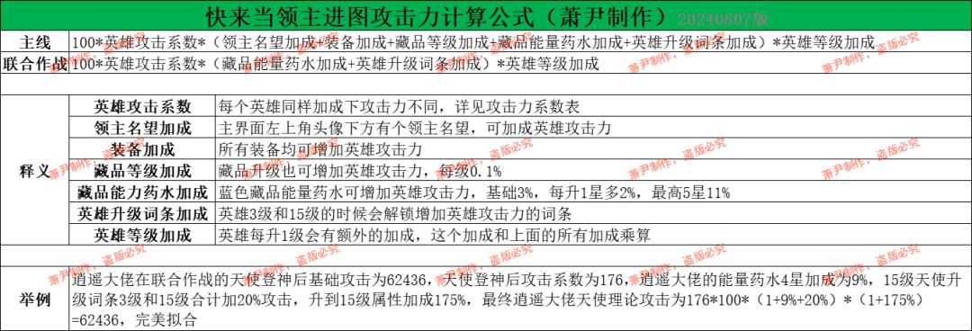 这个图主要是计算进联合作战后,英雄的白字攻击是怎么计算的,同时附带着我测出来的英雄攻击系数和升级加成。 联合作战的攻击里面绿字加成主要受3方面影响,强化加成,英雄的光环加成(企鹅、黑龙、剑灵的光环),藏品锤子的银币加成。