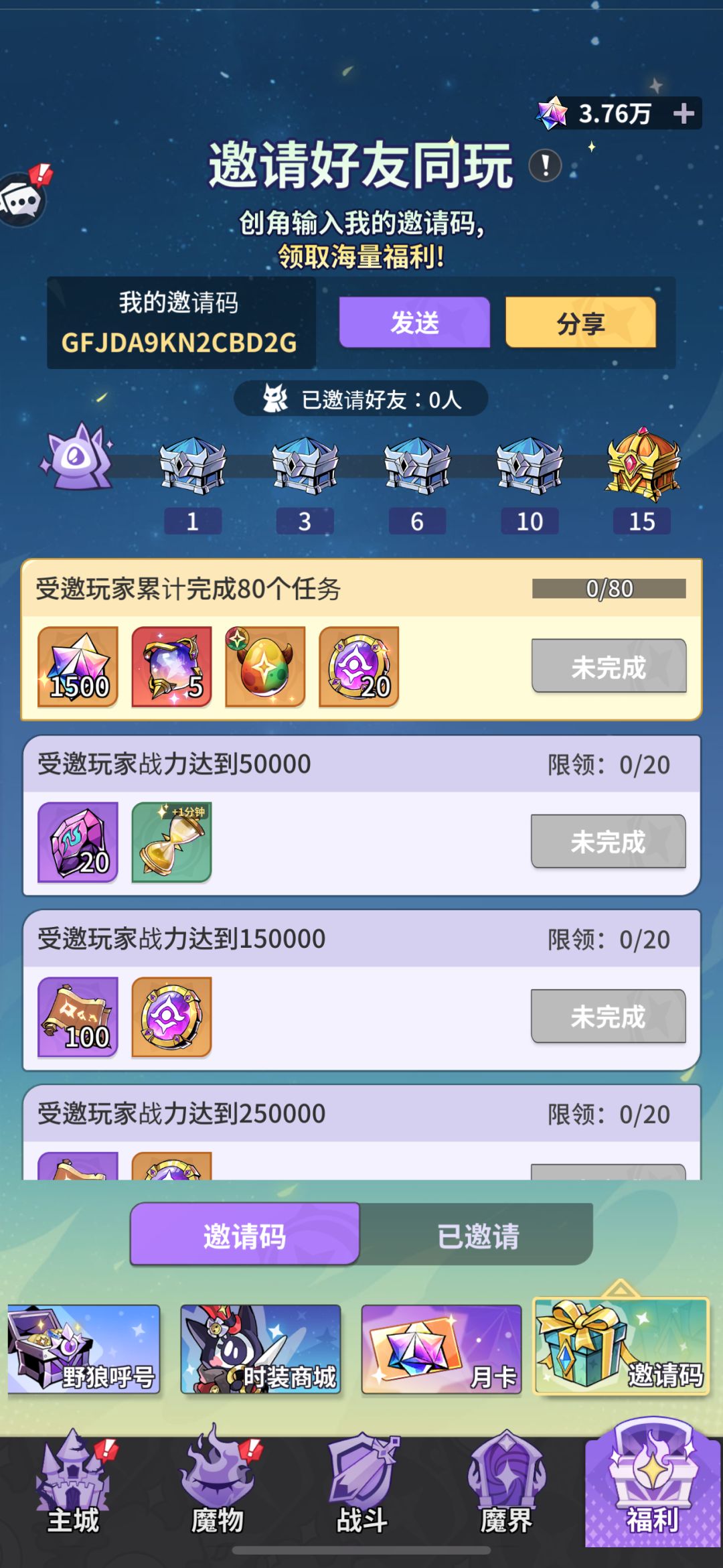 GFU725ZJ77FN7K,主页右下角点击福利,划到最后填写邀请码首次填写 10 连,长期玩,一起做任务拿奖励,祝你们十连双簧魔王种,一起做任务拿奖励 SQZS SQFL DMW666 DMW888 DMW999 LORD111 LORD222 LORD333 LORD444 LORD666 VIP666 VIP888 VIP999 s8 一起玩滴我 #异界原点传说史