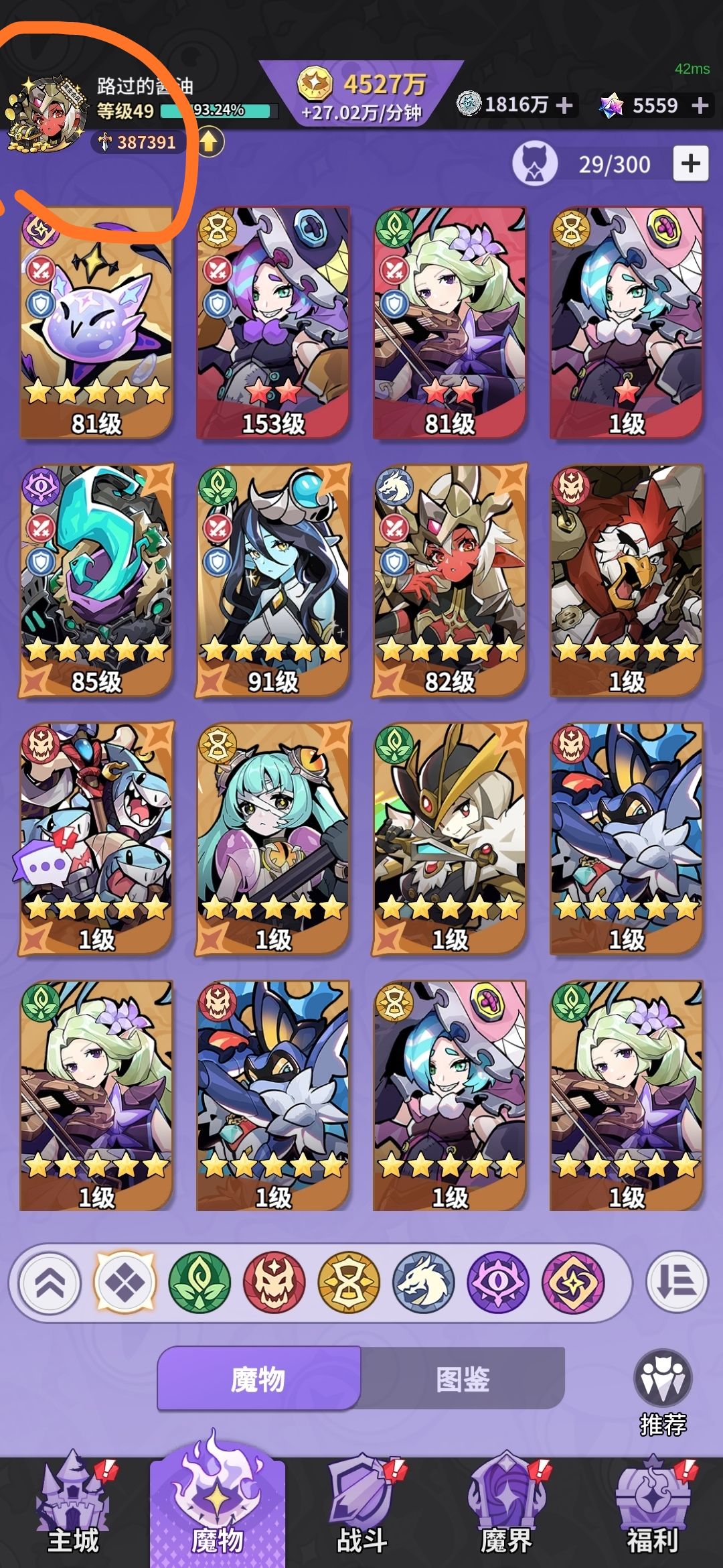 一,主页 1,魔魂 不要用钻石买,很亏。大佬请无视。 2,王座(特殊) 前期为三个小时一次,全员22级之后为1.5个小时一次。后期建议两个魔王均升,成熟体之后可以开另一个魔王。建议同时30级,同时35级。38级之后可以升到280级,两个魔王可以充当两个十一星,减少升级到12星的时间。 这边特别标注,225级之前,每过一关经济关卡加7个加20经验。225~249级是加45。250级到274级是加