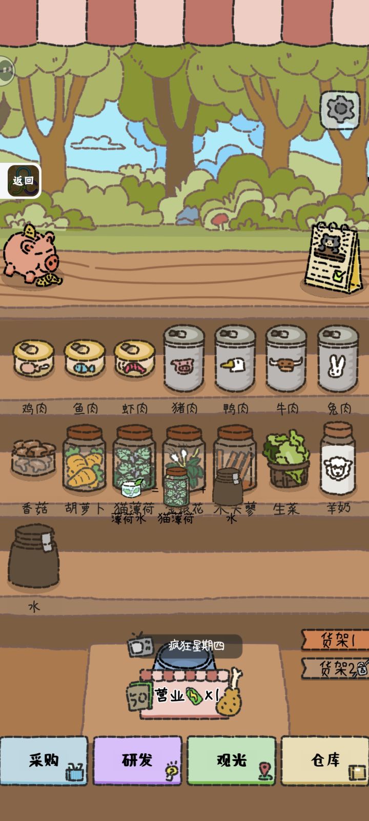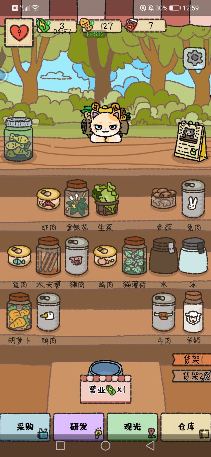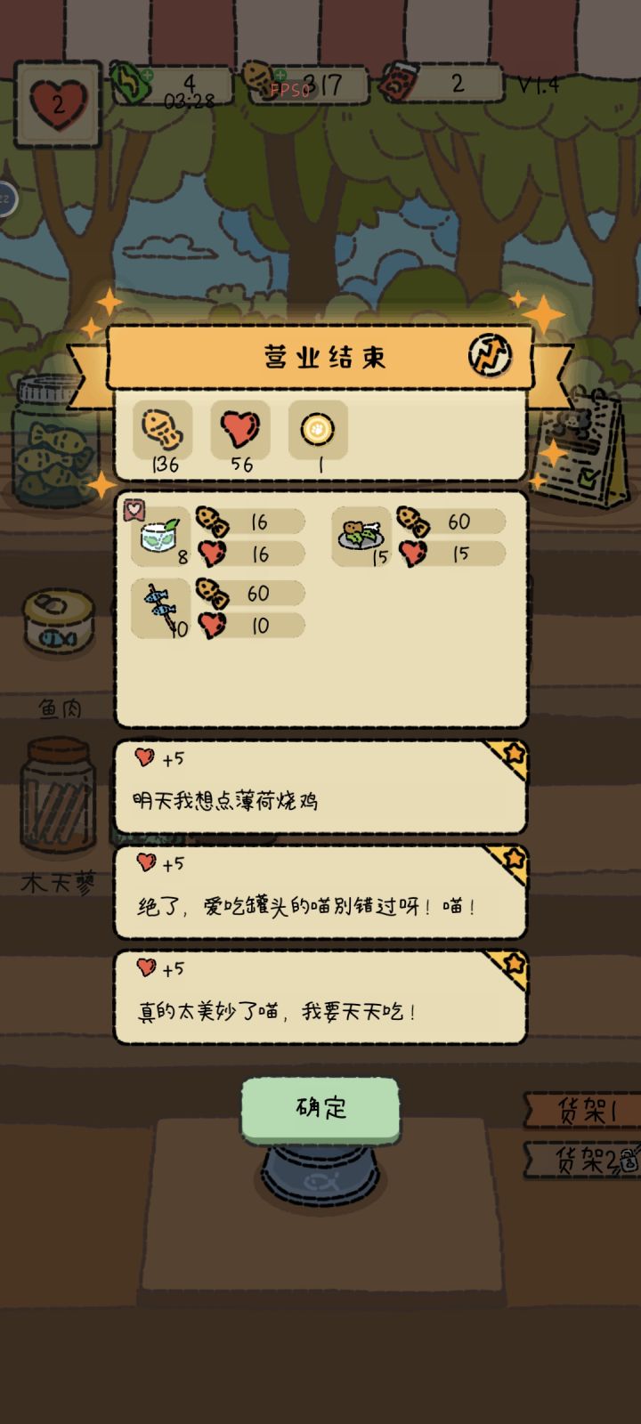 🎮玩法轻度模拟经营类游戏,喜欢小猫的话不要错过~整个店是小猫送的,设定很新奇,带有一点魔幻色彩。操作并不复杂,点击即可。客人全都是点已解锁的菜单,大部分是食材两两一起制作,手速够快完全能应付得来,难度并不高。采用天,也就是关卡制来进行游戏。一天之后可以进行原材料的采购、调整食材摆放位置、新菜研发等操作,也会有一定随机事件,比如高价收某种食材,可以小赚一笔。⚖️养成纯休闲类游戏,养成即对整个