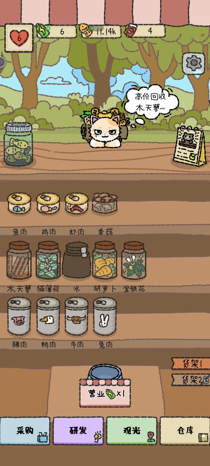 🎮玩法轻度模拟经营类游戏,喜欢小猫的话不要错过~整个店是小猫送的,设定很新奇,带有一点魔幻色彩。操作并不复杂,点击即可。客人全都是点已解锁的菜单,大部分是食材两两一起制作,手速够快完全能应付得来,难度并不高。采用天,也就是关卡制来进行游戏。一天之后可以进行原材料的采购、调整食材摆放位置、新菜研发等操作,也会有一定随机事件,比如高价收某种食材,可以小赚一笔。⚖️养成纯休闲类游戏,养成即对整个