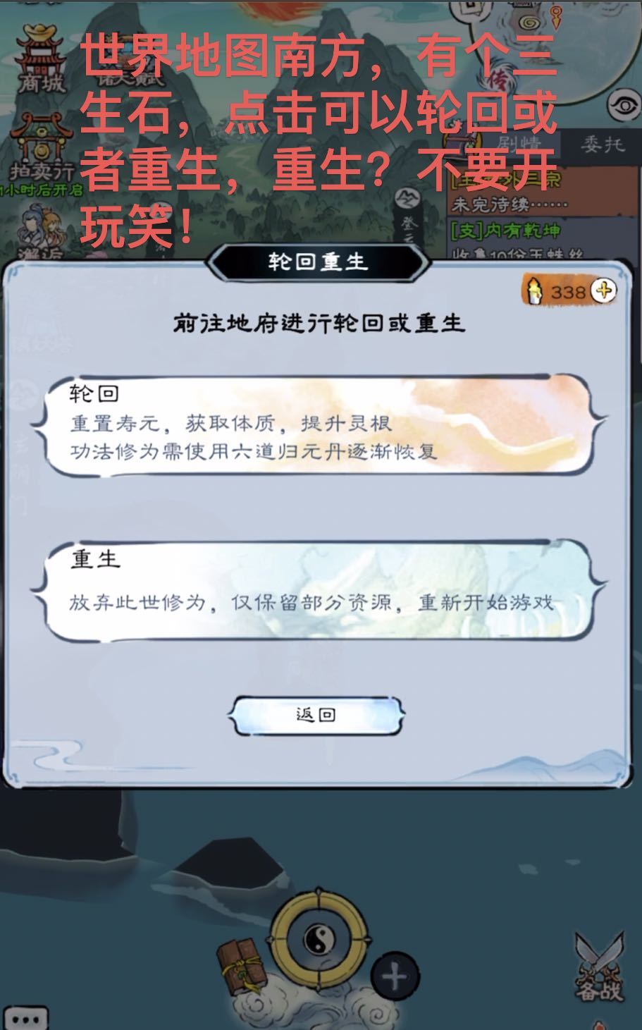 关于轮回的图文解说 #山海攻略 #山海仙路攻略 1.提前攒经验水滴和解毒丹,还有高级经验丹,想轮回后一口气回到结丹。一共850万经验,自己去算,轮回前自己原来的经验分十天以六道丹的形式返还。 2.提前攒上品灵石和友情商店的体质券,到时候抽体质是消耗很大,200上品灵石一抽,50次有个自选体质。大概准备1万到两万的上品灵石,因为抽灵根也要消耗很大。一般也要花三五千上品灵石。 3.轮回后名字重起,且