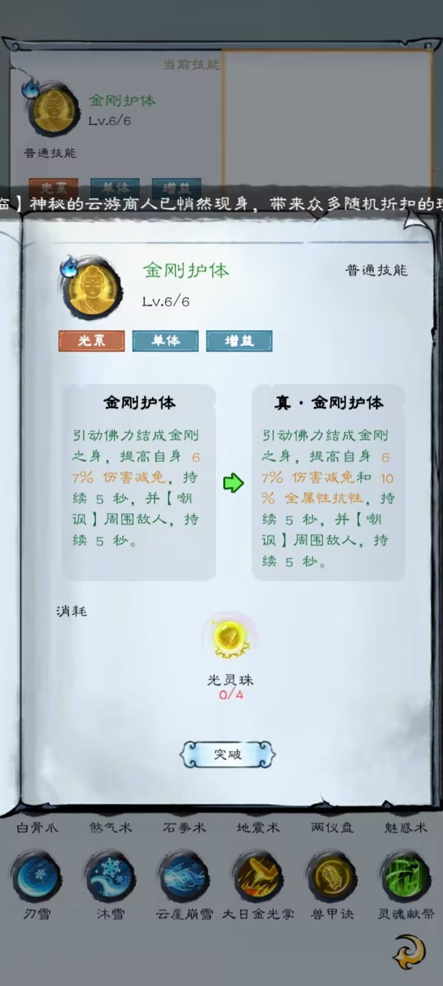 欢迎大佬们补充,以下为各楼对应技能图,目前已记录20个 为了避免大家翻的麻烦,请勿回复无关信息,无关信息我会删除#山海仙路攻略 2.金刚护体 3.水牢术 5.绽放术 6.灵魂献祭 8.灵焰术 9.御灵术 10.鬼影缠身 11.天阳火 13.回春术 18.藤蔓术 20.荆棘术 21.灵盾术 22.逐怨鬼手 23.白骨爪 24.煞气术 26.巨力打击 27.魅惑术 28.春水诀 29.狩猎 30.水