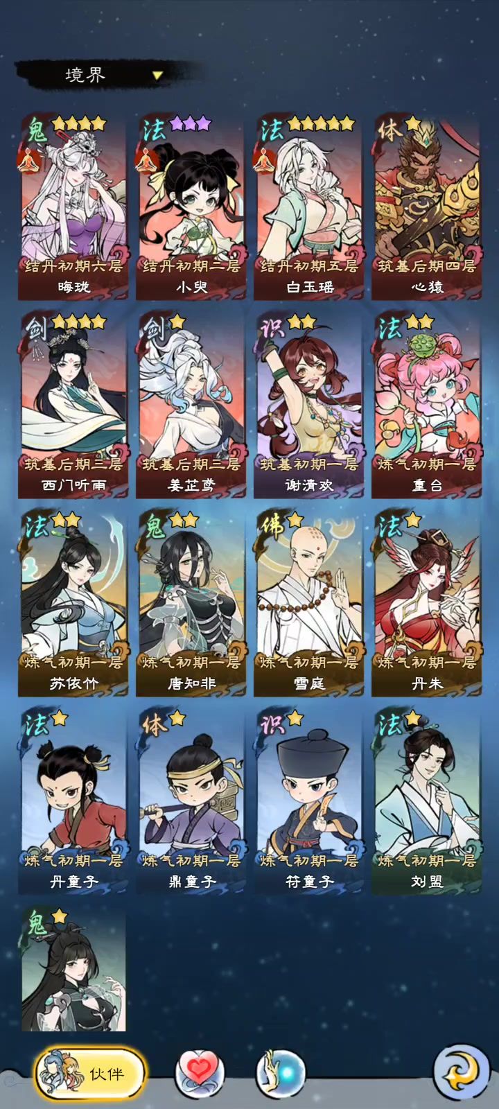 拿一个闲置的伙伴(喂点丹药),然后传功给牢姜。试试能不能恢复正常(传功会更新境界)