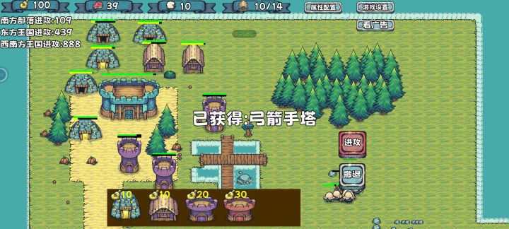 开局三金矿一粮仓,先给金矿升级,看左上角对面要进攻的时候,你就建兵营,兵营可以直接升满,然后先去打右边的拿弓箭,然后拆掉一个兵营,建弓箭,把下面那个打了,就用步兵和弓箭手就行,后面有英雄塔,可以建,金矿和粮仓看着建,打人顺序你就看左上角他们进攻时间打就行(只说了开局攻略,开局做好了,后面随便乱杀)#攻略