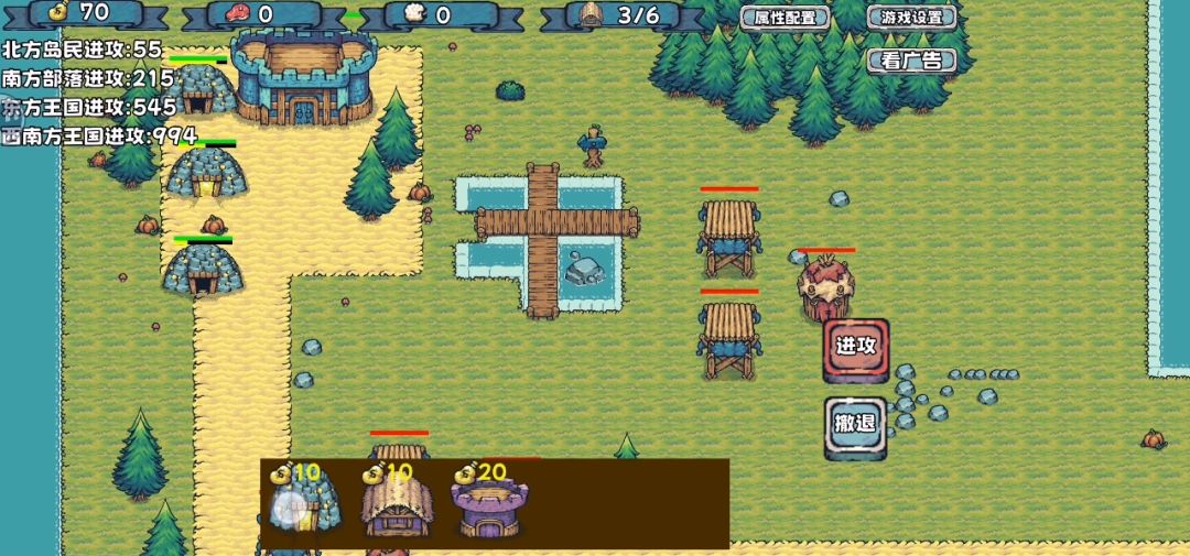 开局三金矿一粮仓,先给金矿升级,看左上角对面要进攻的时候,你就建兵营,兵营可以直接升满,然后先去打右边的拿弓箭,然后拆掉一个兵营,建弓箭,把下面那个打了,就用步兵和弓箭手就行,后面有英雄塔,可以建,金矿和粮仓看着建,打人顺序你就看左上角他们进攻时间打就行(只说了开局攻略,开局做好了,后面随便乱杀)#攻略