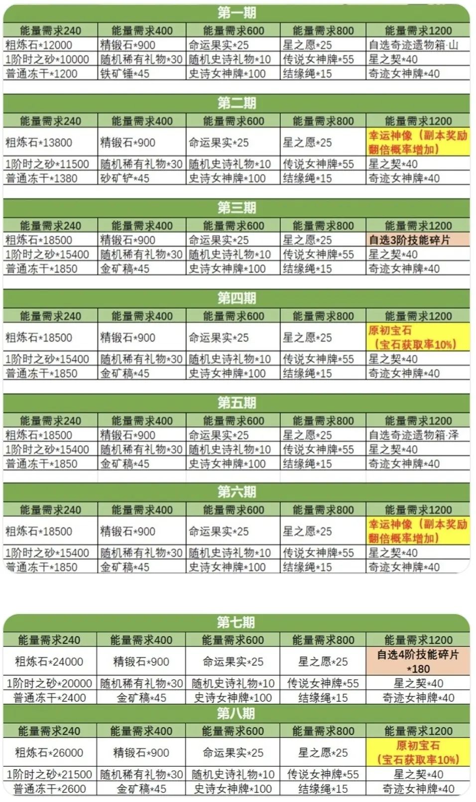 先放结论: 一层:铁矿=沙子>冻干 二层:金矿镐>稀有礼物>精锻石 三层:命运果实≥史诗礼物>史诗女神牌 四层:传说女神牌>结缘绳≈星之愿 五层:选项一>星之契=奇迹女神牌 一层三素材铁矿适合冲高档原初之星,沙子适合凑战力以及低原初档。冻干亏原初太多,当前s2很陷阱。 二层选金镐,因为金矿镐5个价值150晨星,晨星价值明显要高! 三层命运果实略微好。命运果实可以开出白品质石材木材,石材木材