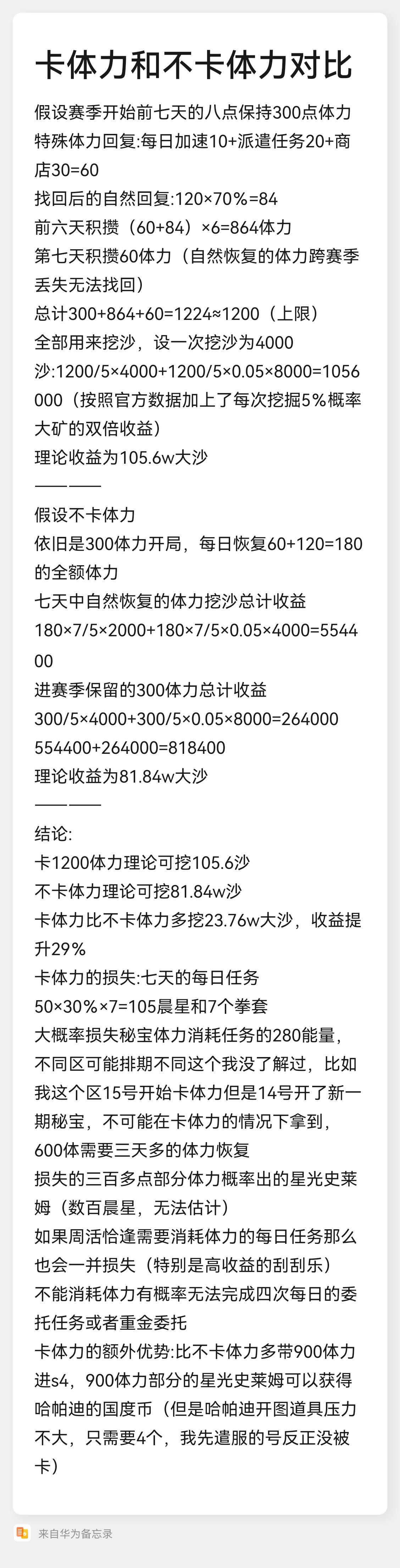 不想看计算过程可以直接拉到下面看结论。24w沙在新国度相当于两百多体力的收益(不算大矿那就是300体),是否要为了这部分收益损失数百晨星和秘宝能量看自己决定。我反正决定是不卡。另外,即使不卡体力也可以在最后一天八点临近新赛季开始前攒满300体,再领取每日任务,商店,加速的体力,可以360体力进新赛季。