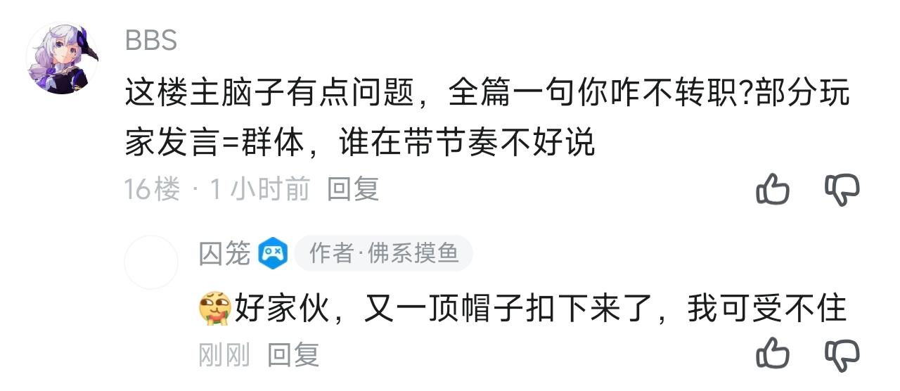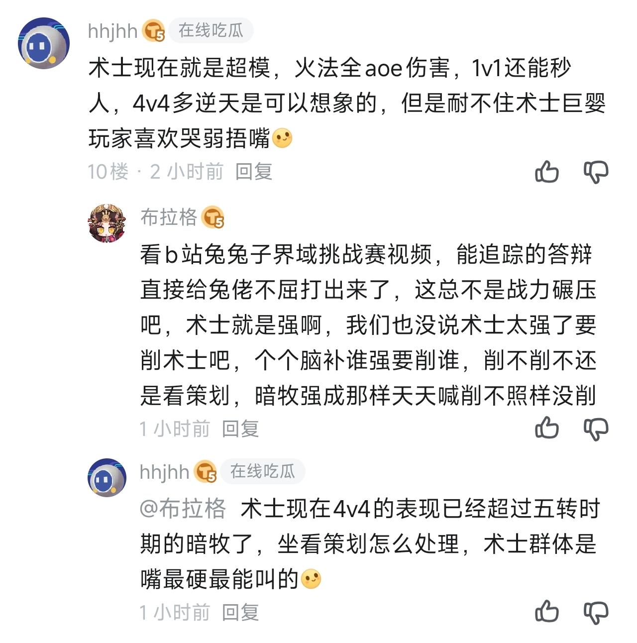 单纯看不惯这些人的嘴脸。总结就是:术士玩家哭弱,骑士和贤者玩家不哭弱,谁都不能说术士强,说了术士玩家会跳脚,我来一一回应。①:部分斗士玩家又来岁月史书了,自从四转斗士一家独大后,另外三家都在哭弱,并不存在只有术士哭弱的情况。②:注意了!部分斗士玩家经典逆天名言来了:你觉得强,那为什么不转斗士呢?转职不是免费吗。他们居然不去喷策划,加强其他职业,而是嘲讽其他职业,为什么不转职。③:后面五转暗