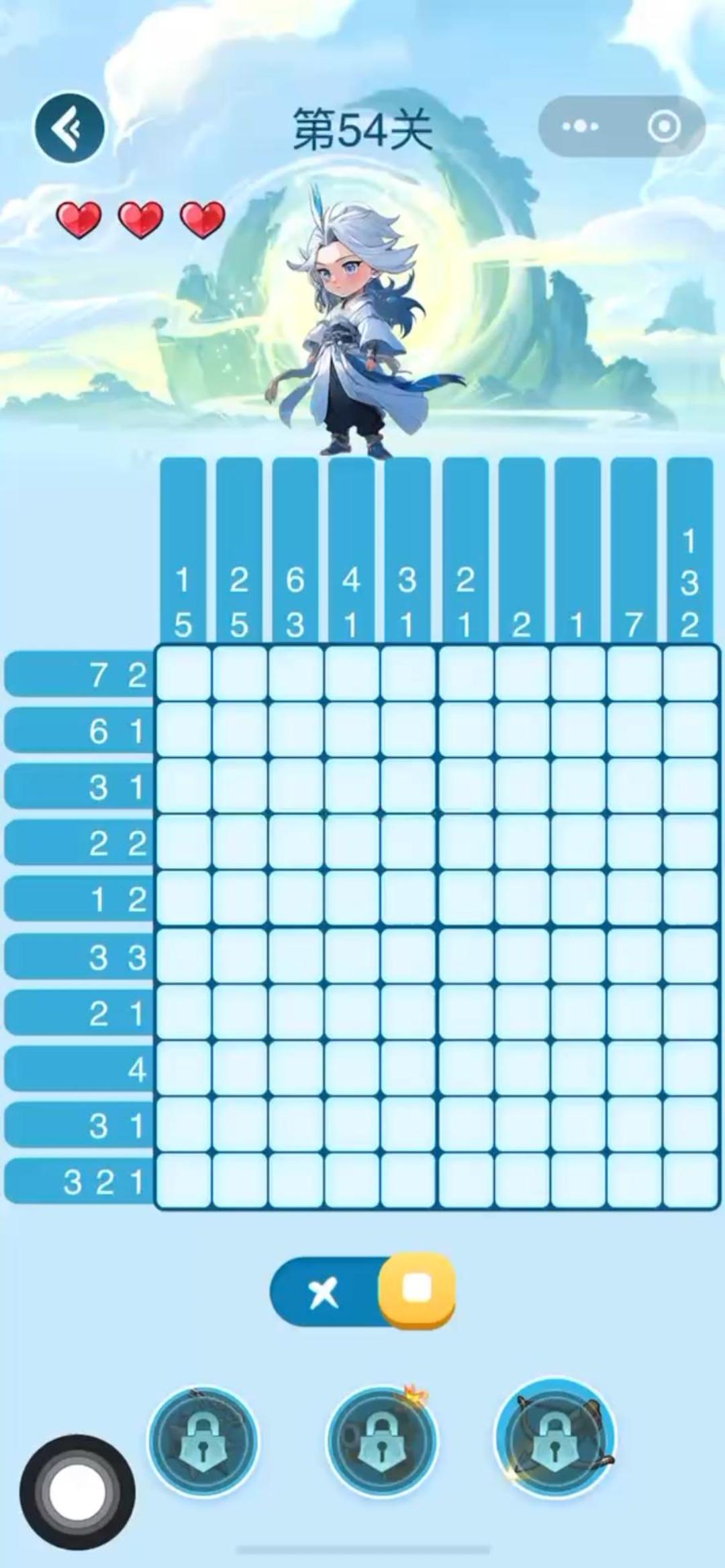 数字魔法织中总共有3种道具,分别是流星锤、炸弹和十字弩 他们的使用场景分别适用于 流星锤:边界划分时不确定的格子,使用流星锤可以事半功倍 炸弹:上下左右都不确定的格子,推荐使用炸弹,效率很高 十字弩:单行/单列分组较多切数字较小,较难推理时,推荐使用十字弩