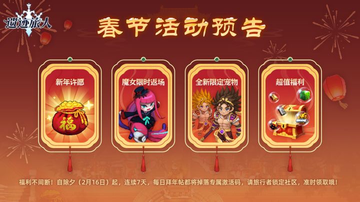 (^-^)V除夕的鞭炮声旅行者听到了吗~我们一起准备新年来临的倒计时吧!今日激活码:chuxiye666兑换码有效期:2026年2月23日24:00前 旅行者们记得及时前往兑换哦!(兑换方式:游戏内点击主界面左上角头像-兑换码-输入激活码内容领取奖励。 )►►►【更多资讯】◄◄◄>>官方网站:>>官方公众号:遗迹旅人>>官方抖音号:遗迹旅人